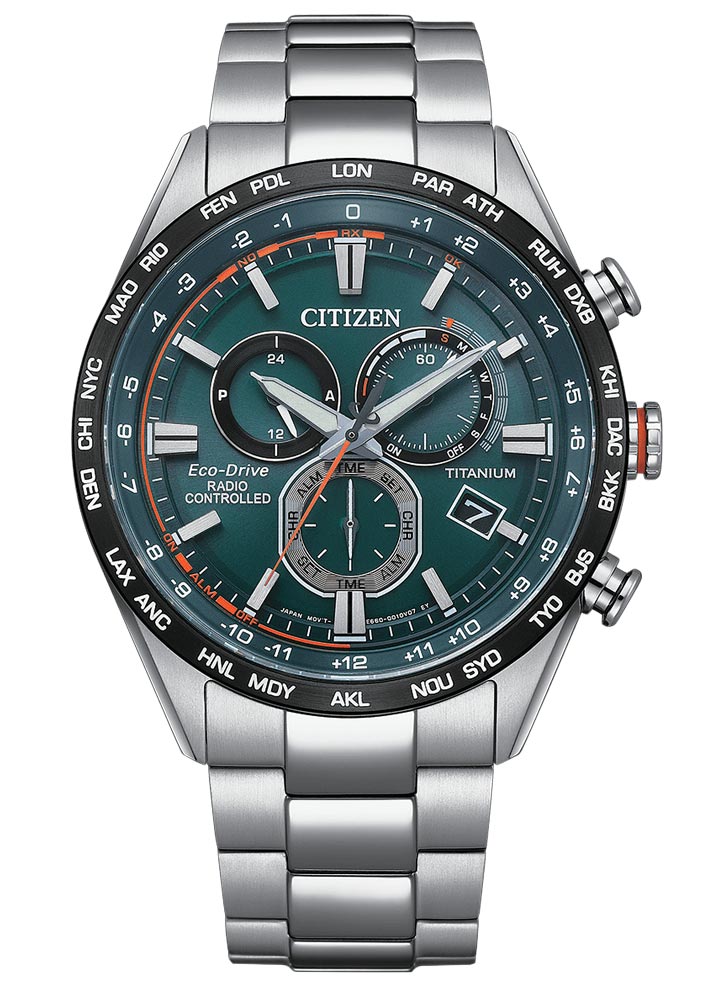 Radio Controlled - srdcem hodinek je spolehlivý, napájený libovolným světelným zdrojem, mechanismus Eco-Drive , který je řízen rádiovými vlnami. Zajišťuje přesný čas a datum synchronizací s rádiovými vysílači, samotným nastavením přesného času a data, i když má měsíc méně než 31 dní. Tyto úžasné hodinky mají také další funkce: alarm, chronograf, indikátor baterie a časová pásma. Jednotlivé názvy měst jsou napsány na černém rámu kolem skla. Stačí zatáhnout za korunku a přesunout vteřinovou ručičku na město, které nás zajímá, a hodinky samy nastaví přesný čas, který se aktuálně nachází v dané zóně.