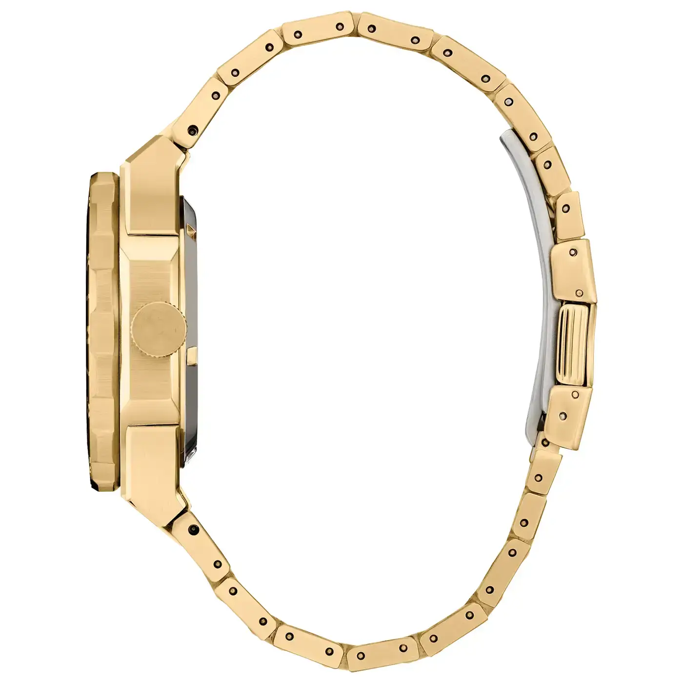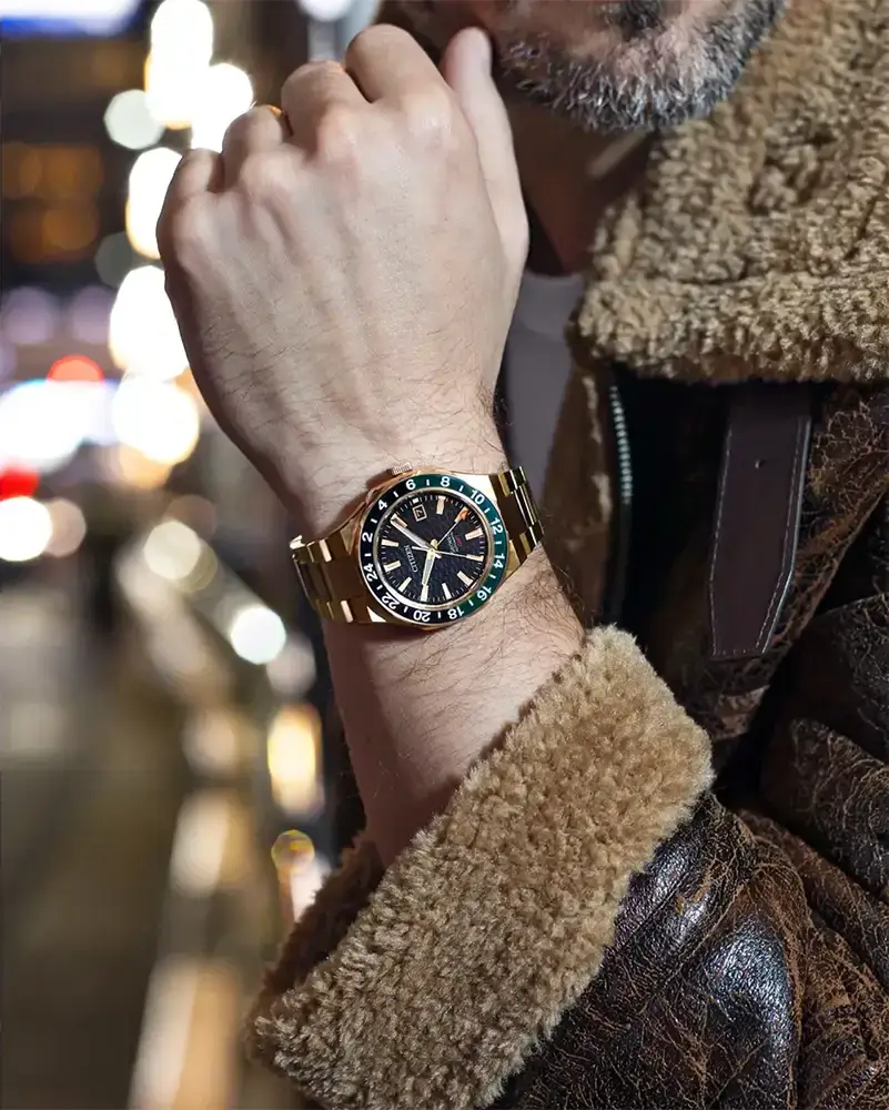 Pánské hodinky Citizen Series 8 880 GMT NB6033-51E jsou výjimečným modelem určeným pro ty, kteří oceňují nejen prvotřídní kvalitu zpracování, ale i spolehlivost v každé situaci. Kombinace pokročilé technologie a moderního designu činí tento Series 8 Automatic GMT unikátním jak mezi sportovními, tak elegantními hodinkami. Pouzdro o průměru 41 mm, vyrobené z nerezové oceli a potažené zlatem, vyzařuje luxus, přičemž si zachovává sportovní charakter díky černo-zelené obousměrné lunetě GMT. Precizní techniky broušení a leštění podtrhují mistrovské řemeslo značky Citizen a nabízejí sofistikovanou hru světla na povrchu hodinek. Ale to není vše – pro maximální funkčnost a pohodlí je model vybaven elegantním, zužujícím se náramkem typu H-link, který dokonale splývá s pouzdrem a vytváří harmonický celek. Díky ergonomickému designu se tyto pánské hodinky se zlatým náramkem skvěle přizpůsobí zápěstí a zaručují pohodlí i při celodenním nošení.
