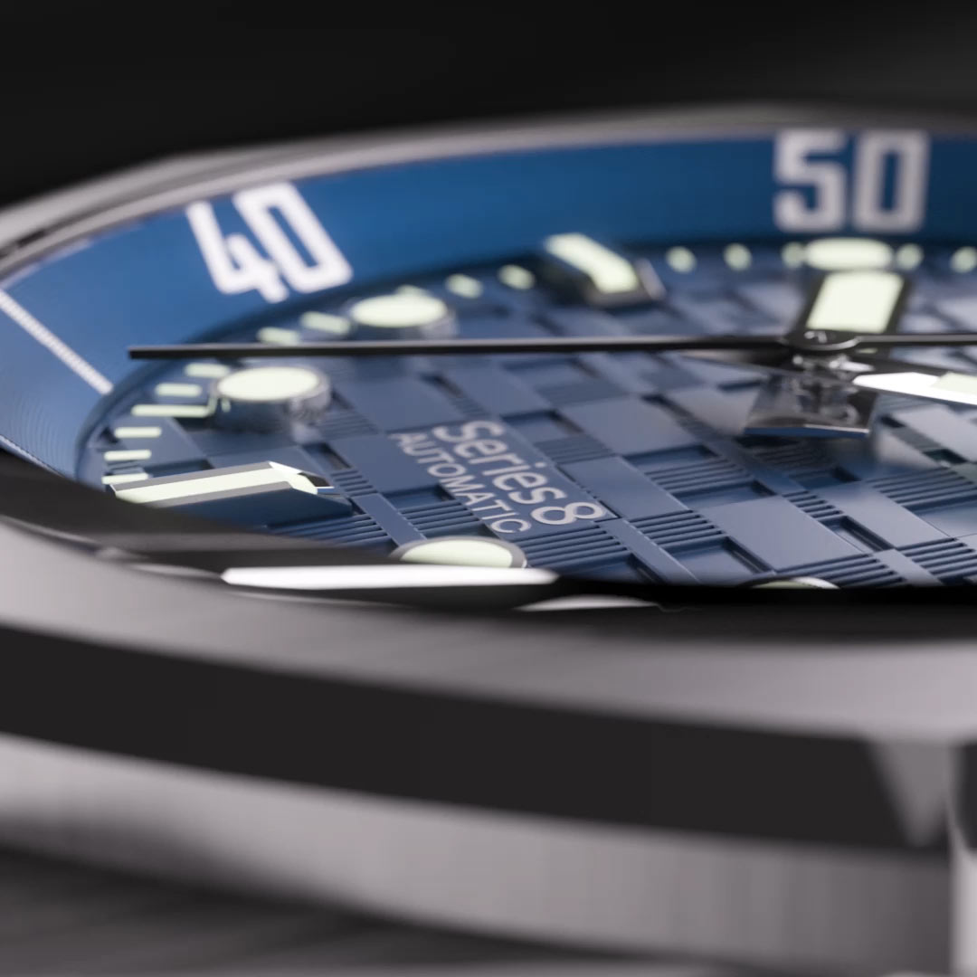 Textura ciferníku těchto hodinek, která debutovala na modelu 880 Mechanical v roce 2023, čerpá inspiraci z noční oblohy nad Tokiem, která je plná mnoha výškových budov různých tvarů oken, což vytváří moderní interpretaci tradiční japonské křížové struktury. Tento vzor, který symbolizuje bohatství japonské kultury, byl nyní obnoven a ještě výraznější na ciferníku z kolekce Series 8. Využitím složených textur ciferníku inspirovaných panorámou Tokia a japonskými motivy blahobytu, použité luminescenční indexy a ručičky zdůrazňují sportovní vzhled modelu Series 8 890, vyvažujíce výrazný styl s čitelností.