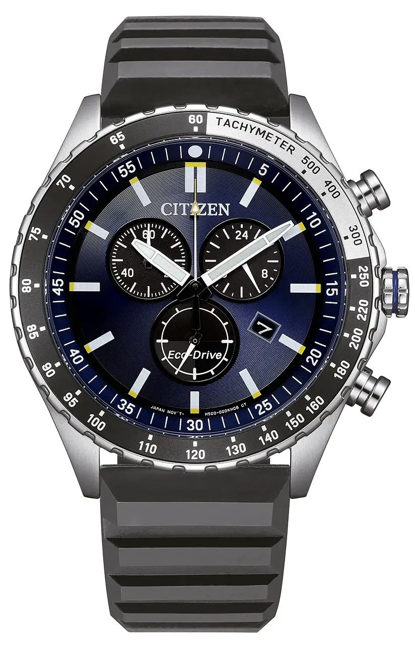 Srdcem zařízení je ekologický strojek Eco-Drive, který přeměňuje jakýkoliv zdroj světla na energii, čímž vylučuje potřebu pravidelné výměny baterie. Na číselníku jsou rozmístěny přehledné ukazatele chronografu, datumovka a doplňkový ukazatel času ve 24hodinovém formátu. Široké ručky a geometrické indexy jsou vyplněny výkonnou luminiscenční hmotou, která zaručuje bezproblémové odečtení času v naprosté tmě nebo při večerních aktivitách.