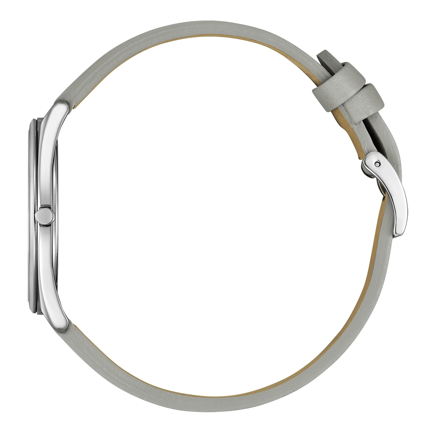 Pouzdro o průměru 38,4 mm je vyrobeno z ušlechtilé oceli ve stříbrné barvě a harmonicky sladěno s číselníkem v jemném růžovém odstínu, který se vyznačuje subtilní texturou a elegantním uspořádáním liniových indexů a arabských číslic na pozici 12 a 6. Celek doplňují štíhlé ručky, které podtrhují moderní a lehký charakter hodinek. Model završuje šedý kožený řemínek s přírodní texturou, zapínaný na klasickou sponu, který zajišťuje stylový vzhled a pohodlí při každodenním nošení.