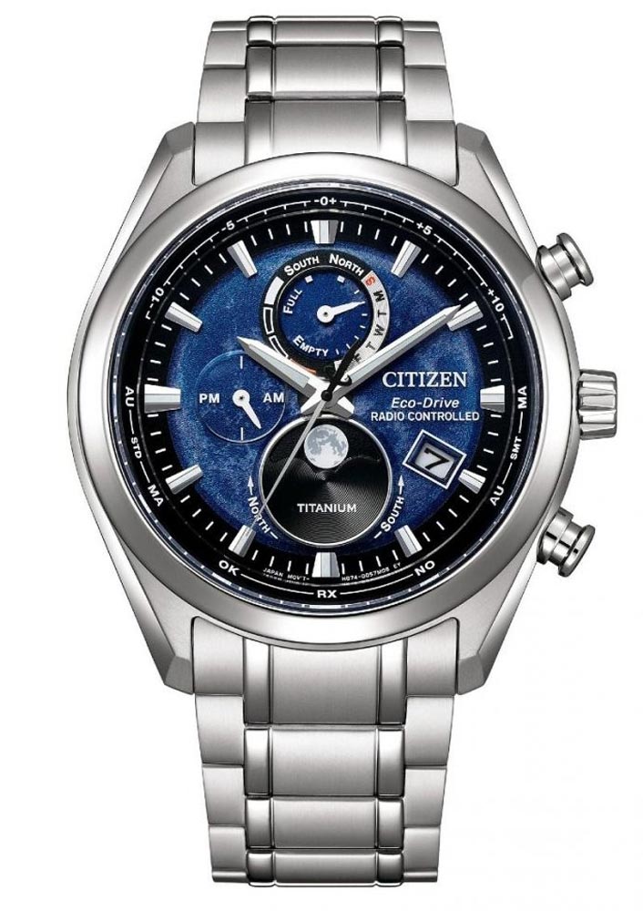 Značka Citizen u tohoto modelu použila extrémně těžko poškrábatelné safírové sklo, které chrání modrý ciferník. Na číselníku v centrálním bodě jsou instalovány viditelné ručičky, které spolu s lineárními indexy udávají aktuální čas. Ručičky a indexy jsou vyplněny luminiscencí, která vám pomůže odečítat čas za zhoršených světelných podmínek. Titanové hodinky Citizen Tsukiyomi Moonphase jsou multifunkční model vybavený: PM/AM subciferník denního času v devět hodin, dvanáct hodin je indikátor nabíjení rezervy chodu, časovač - odpočítávání času, budík - používá se jako budík hodiny nebo signál připomínající důležité události během dne, druhé časové pásmo GMT. Ve čtyři hodiny je datumovka s aktuálním dnem v měsíci. Jednou z nejdůležitějších funkcí je subciferník fáze měsíce, který je umístěn na šesté hodině. Jedná se o fenomenální doplněk zvyšující atraktivitu hodinek, ale také funkci pro lidi žijící v blízkosti přírody nebo zajímající se o astrologii.