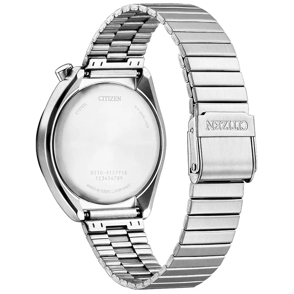 Pouzdro s optimální šířkou 38 mm je vyrobeno z kartáčované nerezové oceli s elegantními černými akcenty, jako je kroužek pouzdra. Hodinky jsou osazeny ocelovým náramkem se stupňovitým vzorem, módním v 70. letech, který se díky plynulé regulaci ideálně přizpůsobí každému obvodu zápěstí. Ačkoli dnešní verze, jako například Citizen Bullhead Tsuno Chrono Racer, nabízejí jiné mechanizmy, tento model sází na osvědčený quartzový strojek s dvanáctihodinovým stopkami. Jsou to hodinky pro sběratele a individualisty, kteří hledají autentickou historii uzavřenou v spolehlivé japonské formě.