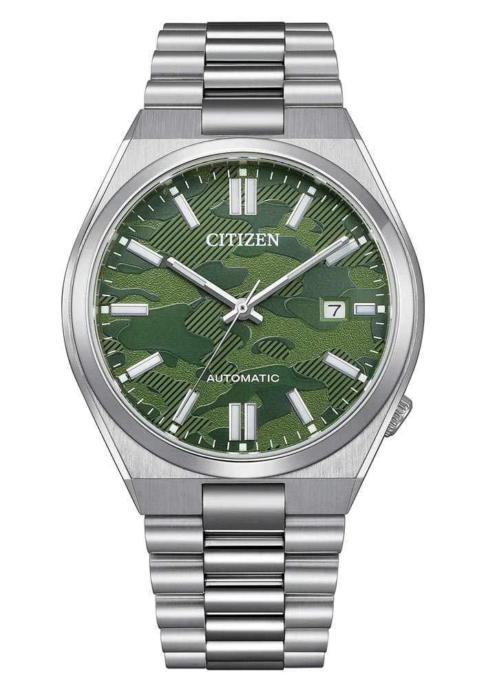 Pod antireflexním safírovým sklem mají tyto pánské hodinky zelený ciferník s kamuflážovým vzorem. Na ciferníku je datumovka zvětšená lupou na pozici 3 hodin a kontrastní stříbrné detaily ručiček a indexů, které dodávají klasickou estetiku. Ručičky jsou potaženy svítící luminiscenční hmotou, která usnadňuje čtení času ve tmě. Tyto automatické hodinky Citizen jsou vybaveny japonským mechanismem Kalibr 8210, který nabízí rezervu chodu až 42 hodin. Osvědčený, přesný mechanismus se pyšní složitou konstrukcí a pozlacenými prvky. Pánské hodinky Citizen s náramkem jsou skvělou volbou pro každou příležitost. Hodí se jak k elegantní, tak k sportovní košili. Budou dokonalým doplňkem pánského šatníku.