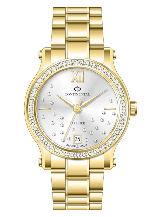 Dámské hodinky Continental 20505-LD202111 v pozlaceném provedení. Vyrobeno z nerezové oceli s PVD povlakem žlutého zlata. Kulaté pouzdro o průměru 32 mm má četné kubické zirkony, které dodávají jiskru. Stejné krystaly najdeme i na stříbrném ciferníku. Obdélníkové a římské indexy fungují krásně ostrými rukama. Lesklý náramek se zapíná na knoflíky. Jeho pohyblivé články lze zkrátit a přizpůsobit zápěstí každé ženy. Hodinky využívají quartzový Machineek s funkcí data a EOL, který prostřednictvím sekundové ručičky naskakující každé 4 sekundy informuje o vybití baterie. Klasický, švýcarský Continental vypadá nejlépe v kombinaci s elegantním outfitem, ale bude se hodit i ke každodennímu oblečení.