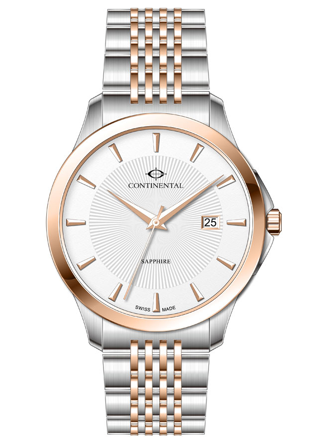 Klasické pánské hodinky Continental 20506-GD815130 s krásně zdobeným ciferníkem. Z jeho středu vyzařuje radiální vzor a ciferník obklopuje matná bílá luneta s indexy z růžového zlata. Tato barva odráží nabroušené ručičky, datumové okénko a PVD pozlacené prvky na pouzdru a náramku. Pevný náramek v matně zlacené úpravě se otevírá pomocí knoflíků. Hodinky Continental klasického designu budou působit efektně jak v kombinaci s elegantní košilí, tak džíny. Utěsněný na třídu 50 metrů, vybavený safírovým sklem, bude skvělým partnerem po mnoho let.