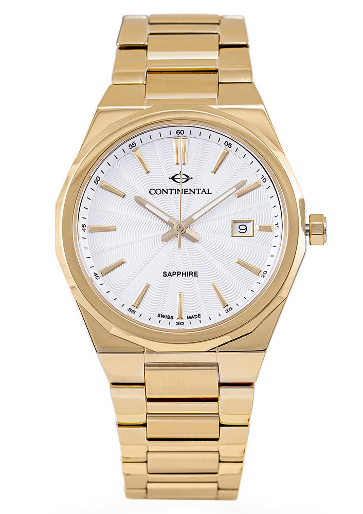 Pánské hodinky Continental 21451-GD202130 vyrobené z nerezové oceli s PVD povlakem žlutého zlata. Hodinky s ostrými hranami, ale také kompaktními rozměry. Pouzdro o průměru 41 mm zdobí kulatý prsten s obdélníkovým zakončením. Safírové sklo odolné proti poškrábání chrání krásně zdobený ciferník se vzorem vln vycházejících z jeho středu. Náramek je s pouzdrem spojen tak, že tvoří celistvý, soudržný celek. Bezpečí při nošení zajišťuje motýlková spona otevřená pomocí knoflíků.