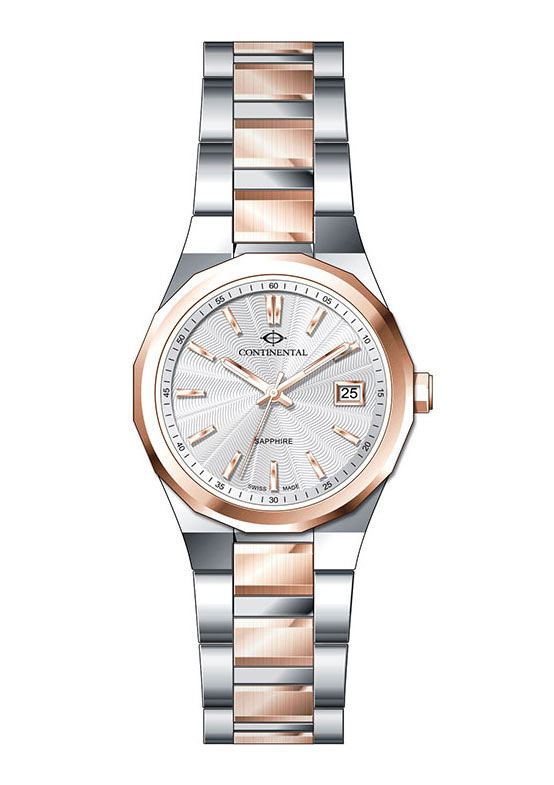 Jeho 28,50 mm pouzdro je vyrobeno ze stříbrné a růžové zlaté nerezové oceli, což mu dodává jemný a elegantní vzhled. Díky zlacení pouzdra vyzařují hodinky Continental luxus. Design a módní barvy z něj udělají nepostradatelný prvek každého elegantního stylingu. Toto je perfektní nabídka pro ženy, které oceňují nejen přesnost času, ale také estetiku doplňků. Prezentovaná časomíra je upevněna na pevném náramku s bezpečnou motýlkovou sponou. Jeho barvy ladí s pouzdrem - vnější stříbrné články jsou doplněny růžovo-zlatými články.