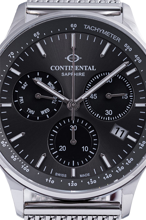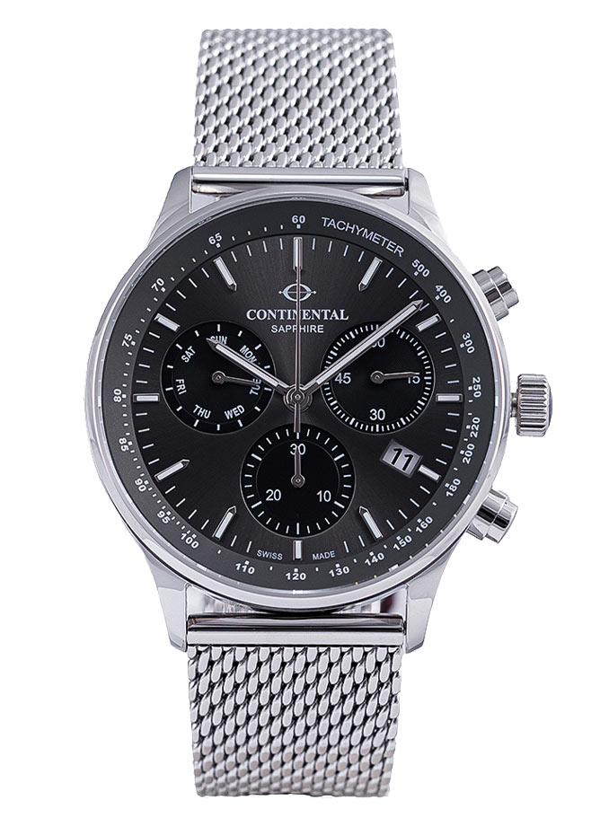 Švýcarský mechanismus Ronda použitý v těchto hodinkách zaručuje nejen přesnost indikací, ale také spolehlivost chodu chronografu, datumovky a tachymetru. To vše uzavřeno v klasické podobě, která z Continentalu na síťovaném náramku dělá nejen hodinky, ale také výraz stylu a funkčnosti.