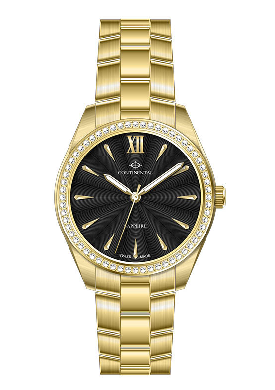 Pouzdro o průměru 32,50 mm je mistrovsky vyrobeno z nerezové oceli a povrchově upraveno ve zlatých tónech, což mu dodává vytříbený charakter. Je zdobený lesklými krystaly. Pevný náramek s bezpečnou a pohodlnou motýlkovou sponou harmonicky ladí s barvou pouzdra a tvoří tak ucelený celek. Černý ciferník hodinek s lineárními indexy, chráněný safírovým sklem odolným proti poškrábání, vyzařuje klasické kouzlo. Indexy a ocelové ručičky dokonale splývají s tmavým pozadím a dodávají hodinkám jedinečnou záři. Mechanismus ETA Swiss Made, umístěný pod číselníkem, zaručuje přesnost a spolehlivost chodu.