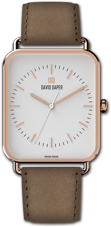Pozlacené pánské módní hodinky David Daper Time Square 02 RG 01 C01. Moderní a minimalistický lifestylový doplněk pro městské cestovatele a hledače dobrodružství. Dokonale se bude hodit k majiteli mobilu, který se drží myšlenek autenticity a nezávislosti. Obdélníkové pánské hodinky David Daper 02 RG 01 C01 jsou rozpoznatelné pro svou originalitu a luxusní švýcarský standard za dostupnou cenu. Jeho snadno čitelný ciferník s výrazným, jednoduchým a elegantním vzhledem je chráněn prémiovým safírovým sklem. Poskytuje nejvyšší odolnost proti poškrábání a čistotu, kterou může moderní hodinářství nabídnout. Leštěné pouzdro těchto pánských módních hodinek má rozměry 38 × 32 a je vyrobeno z vysoce odolné proti poškrábání a korozi odolné růžově pozlacené nerezové oceli. Přes očka visí hnědý kožený řemínek, který v kombinaci s jasným ciferníkem a zlatým třpytem dodává výše uvedenému modelu moderní vintage nádech.