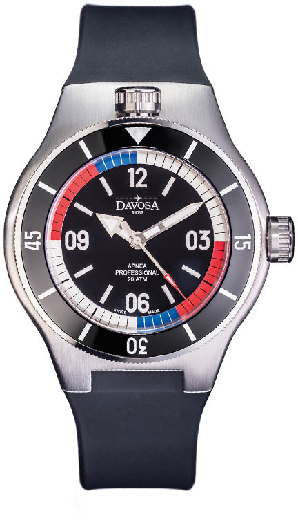 První pozoruhodnou vlastností Davosa Apnea Diver Automatic je keramický rámeček kolem číselníku. Tyto barevné lunety ciferníku zde nejsou náhodou. Dech se na 5 sekund nasaje, když je sekundová ruka v modré oblasti, poté se zadrží na 15 sekund, když je sekundová ruka v bílé oblasti, a poté se na 10 sekund vydechne v červené oblasti. Pomocí tohoto barevného kódu se může freediver plně soustředit na tento důležitý cvik, aniž by musel počítat nebo používat stopky. Při tomto dechovém cvičení musí být hodinky ve vzpřímené poloze. Davosa Apnea Diver Automatic nabízí dokonalé řešení a zároveň zůstává vodotěsným profesionálním náMachineem pro freediving. Odšroubováním korunky na 3. hodině lze střední část hodinek vysunout a díky speciálnímu drápu je umístit vertikálně. Davosa Apnea Diver Automatic jsou profesionální diverské hodinky se šroubovacím zadním pouzdrem, korunkou a třídou vodotěsnosti 20 bar/20 ATM. Díky silnému safírovému sklíčku s antireflexní vrstvou jsou hodinky neuvěřitelně čitelné i pod vodou. Speciální, číslovaná edice hodinek, balená ve speciální krabičce, která obsahuje další modrý gumový řemínek a náMachine na jeho výměnu.