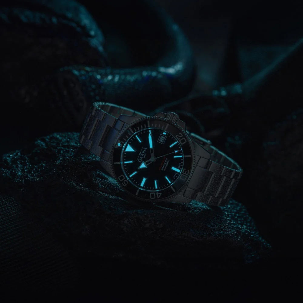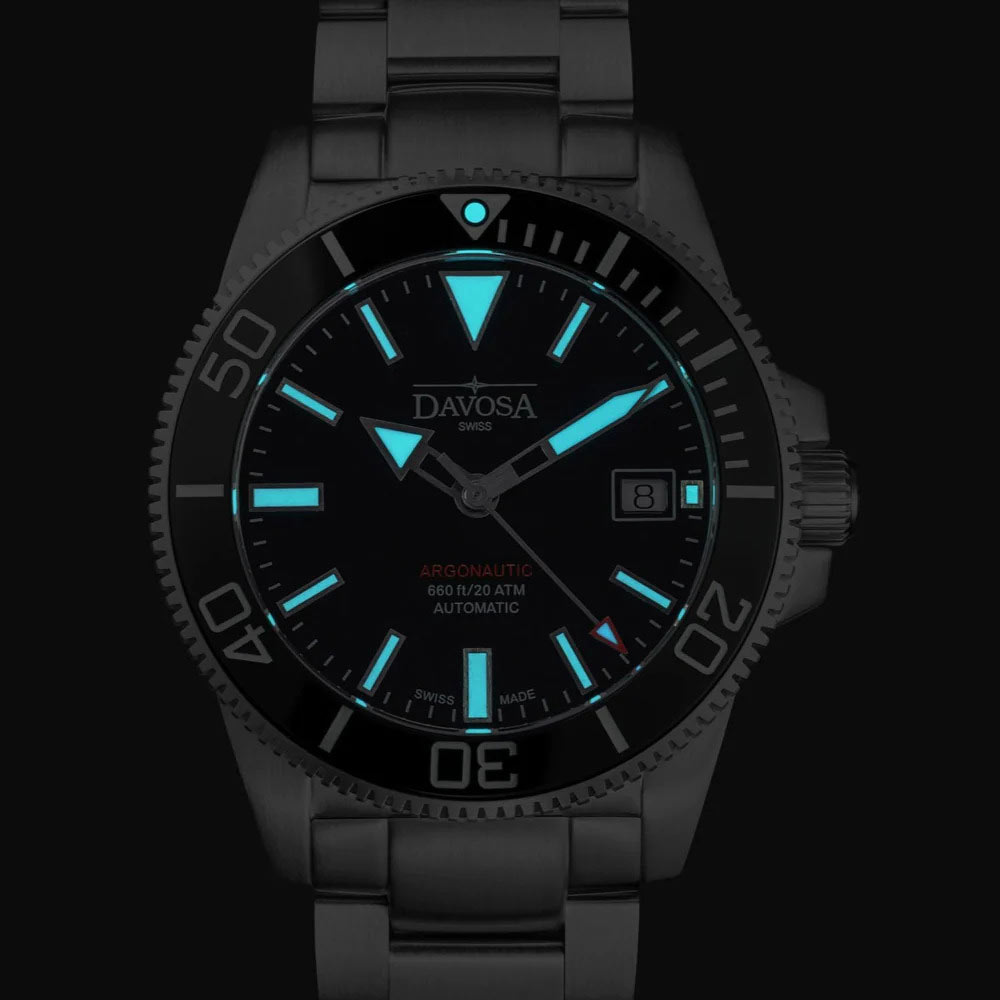 Černý ciferník kryje tvrdé a vysoce odolné safírové sklíčko. Čas je indikován velkými ručičkami a přehlednými indexy v celých hodinových bodech. Značka Davosa pečující o výbornou čitelnost ciferníku naplnila ručičky a indexy švýcarskou luminiscenční hmotou Super-LumiNova® BGW9. Svítí velmi jasným světlem, které zaručuje čtení za všech světelných podmínek. Ve tři hodiny nastupuje datumové okno. Okno se světlým pozadím zobrazuje aktuální den v měsíci. Design ciferníku umožňuje okamžité odečtení času již po jediném pohledu.