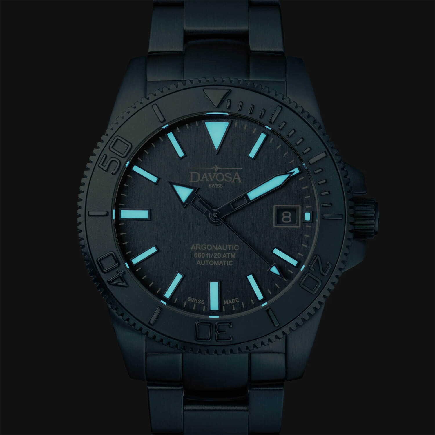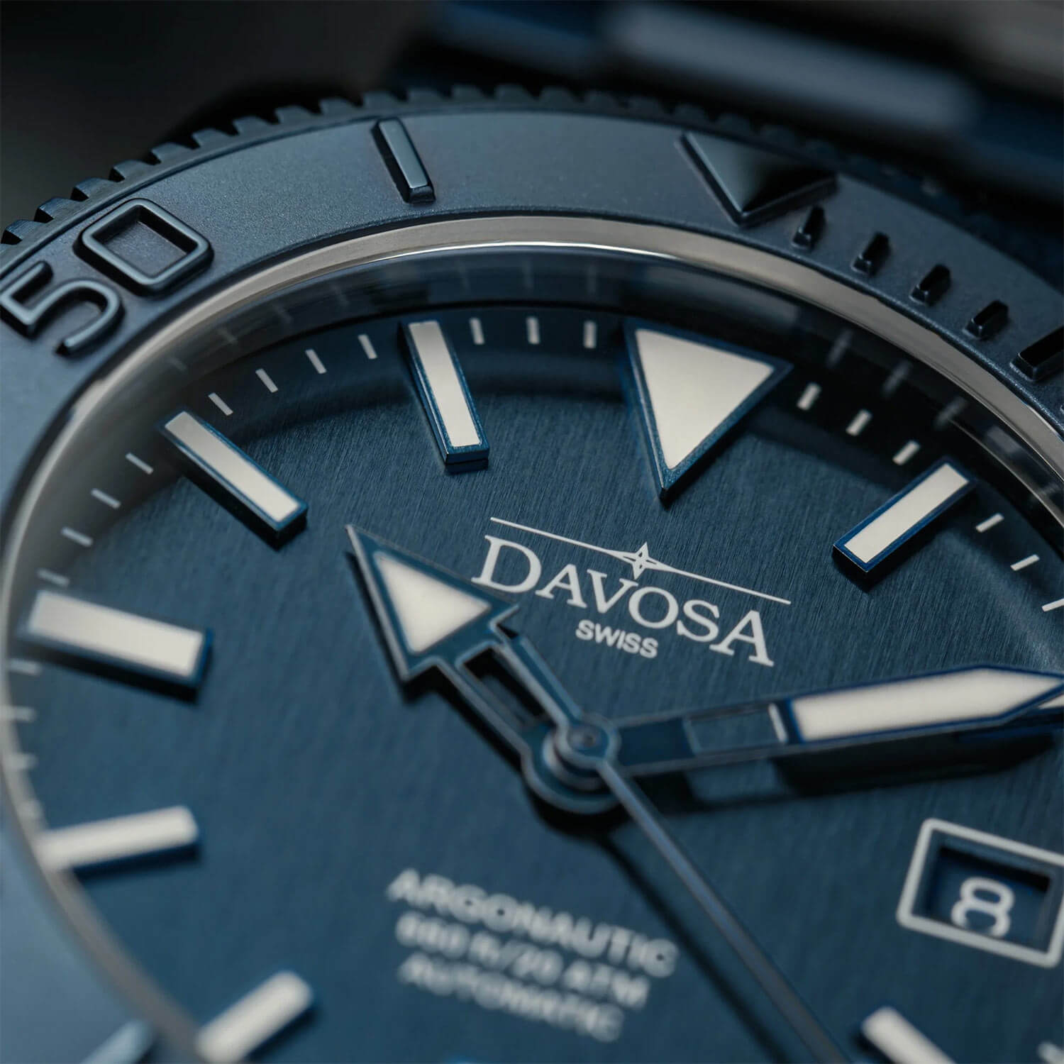 Modrý ciferník kryje tvrdé safírové sklíčko odolné proti poškrábání. Čas je indikován velkými ručičkami a přehlednými indexy v celých hodinových bodech. Značka Davosa pečující o výbornou čitelnost ciferníku naplnila ručičky a indexy švýcarskou luminiscenční hmotou Super-LumiNova® BGW9. Svítí velmi jasným světlem, které zaručuje čtení za všech světelných podmínek. Ve tři hodiny nastupuje datumové okno. Okno s tmavým pozadím zobrazuje aktuální den v měsíci. Design ciferníku umožňuje okamžité odečtení času již po jediném pohledu.