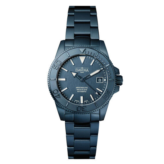Potápěčské hodinky Davosa Argonautic 39 Limited Edition 39 161.540.40 mají kulaté pouzdro vyrobené z modré nerezové oceli 316L s PVD povlakem. Hodinky 39.50 mm mají třídu vodotěsnosti do 200 metrů - s hodinkami Davos můžete plavat a potápět se. Uvnitř pouzdra je instalován automatický švýcarský strojek, který je poháněn pohybem zápěstí. Důležitou ochranou celé konstrukce je šroubovací korunka a záda pouzdra. Na přední straně pouzdra je otočná luneta se stupnicí, která vám pomůže sledovat ubíhající čas v minutách. Výrobce svůj produkt zkombinoval s pevným náramkem s motýlkovým zapínáním. Bezpečně se obepne kolem vašeho zápěstí a zajistí pohodlí při používání tohoto modelu.