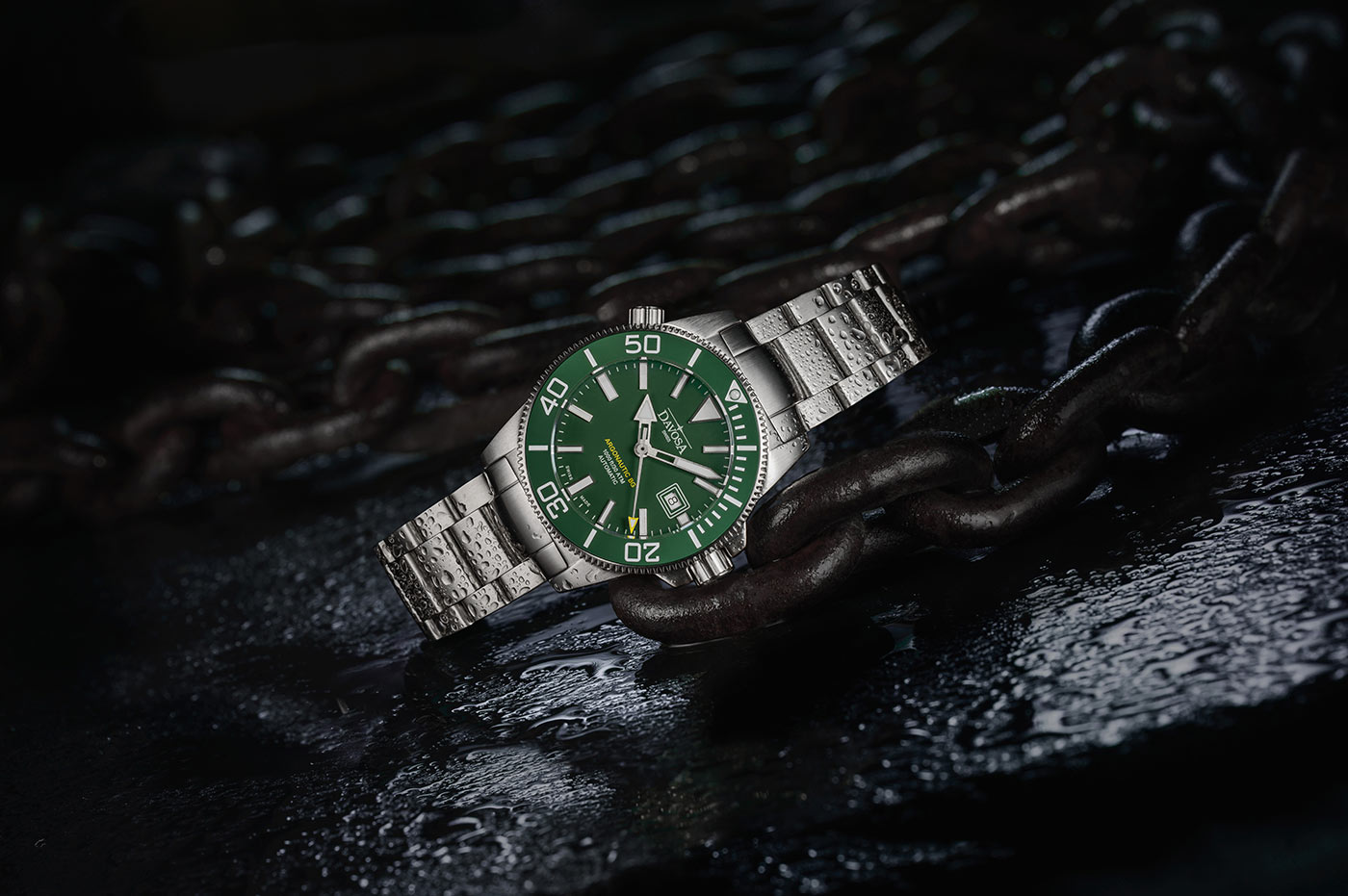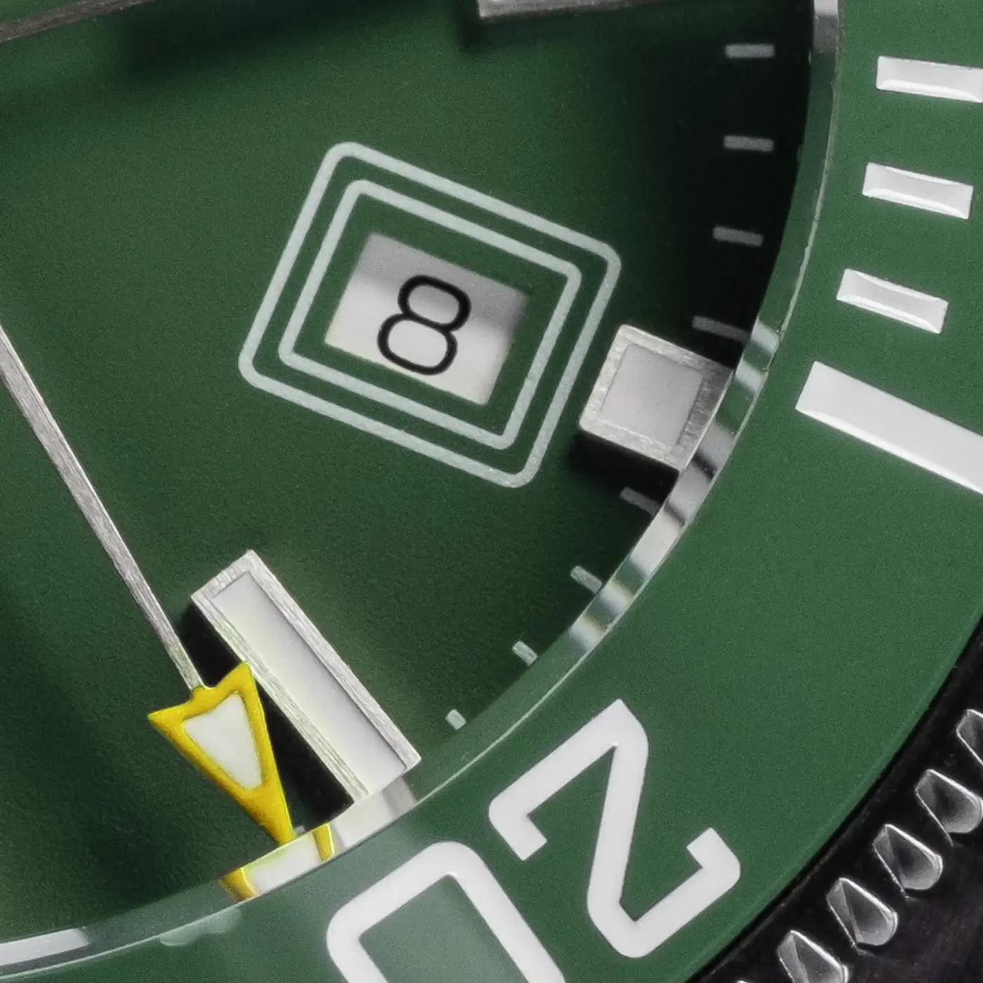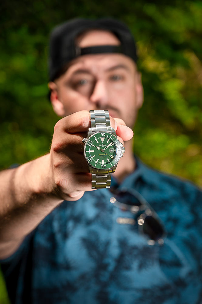 Zelený ciferník v kombinaci s keramickou potápěčskou lunetou ve stejné barvě dodává hodinkám svěží, dynamický charakter. Jednosměrně otočná luneta je odolná proti poškrábání a díky hlubokým zářezům zůstává snadno ovladatelná i v potápěčských rukavicích. Indexy a ručky jsou pokryté luminiscenční vrstvou SuperLumiNova® BG W9, která září intenzivním modrým odstínem a zajišťuje čitelnost i ve tmě.