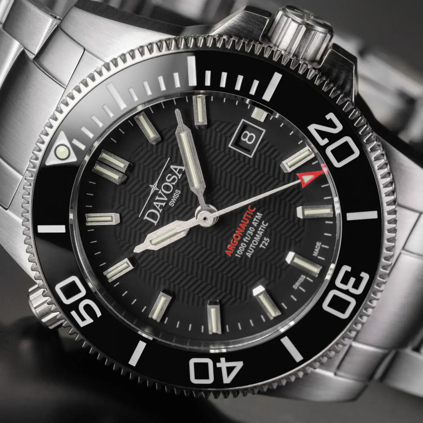 Davosa Argonautic Lumis 161.529.20W jsou profesionální potápěčské hodinky, ve kterých se inovativní technologie tritiového podsvícení spojuje s pokročilou konstrukcí pro náročné uživatele. Trubičky s plynným tritiem umístěné na indexech a ručkách vyzařují stálé, rovnoměrné světlo po mnoho let – bez nutnosti nabíjení či aktivace vnějším zdrojem energie. Díky tomu model garantuje bezkonkurenční čitelnost v absolutní tmě, jak pod vodou, tak i na souši.