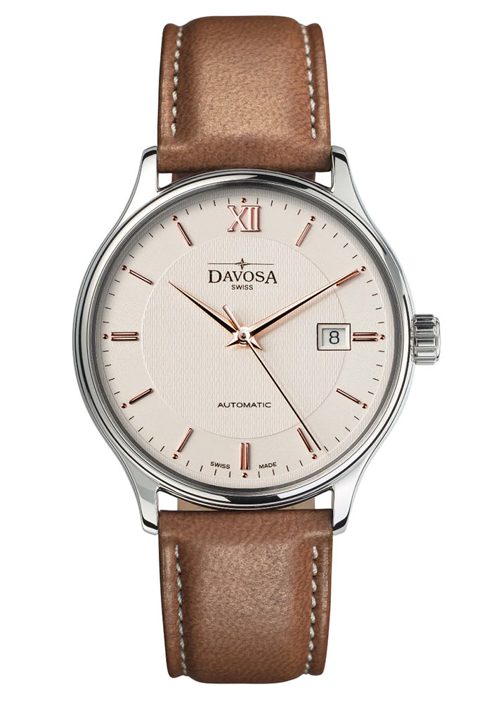 Elegantní a klasické pánské hodinky Davosa Classic Automatic 161.456.32V s automatickým Machinekem. Dobře čitelný béžový ciferník zdobený růžovým zlatem smíšenými indexy a šípovými ručičkami. Kulaté a úhledné pouzdro z nerezové oceli je vyleštěno do vysokého lesku. Ze spodní strany hodinek se nachází přišroubované skleněné pouzdro s krásně zdobeným automatickým Machineem Davosa DAV 3021. Eleganci doplňuje hnědý hladký řemínek s bílým prošíváním z veganské kůže.