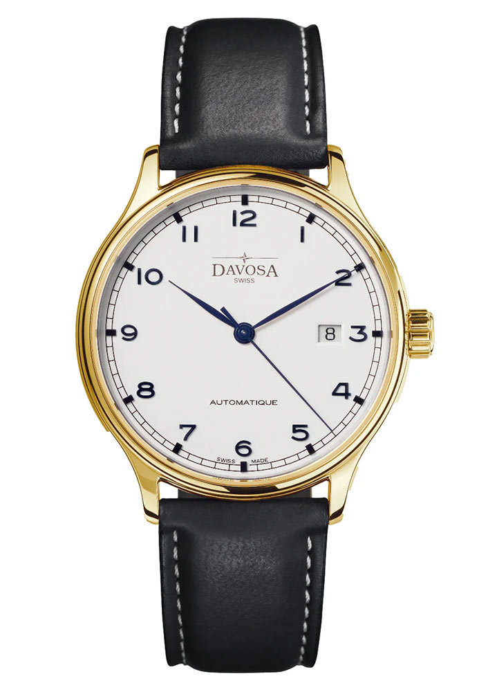 Elegantní a klasické pánské hodinky Davosa Classic Automatic s automatickým Machinekem. Čirý, bílý ciferník zdobí arabské indexy a jednoduché modré ručičky.