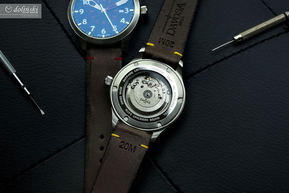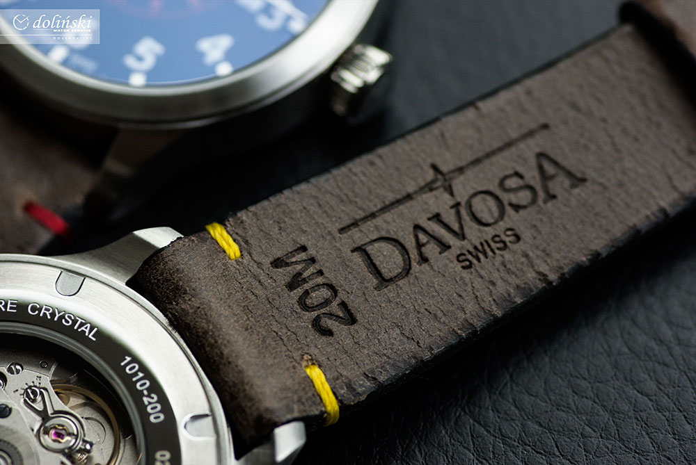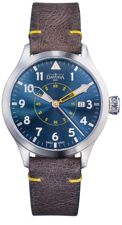 Pánské hodinky pro milovníky nebe, Davosa Neoteric Pilot Automatic. Pouzdro z nerezové oceli o průměru 42 mm, v něm pevně uzavřený ciferník a korunka pro nastavení času dodávají této mimořádné časomíře jedinečný styl, Pilot. Dobře čitelný modrý číselník s arabskými číslicemi má uprostřed žluté značky minut. Tři různé ručky, včetně hodinové a minutové, jsou částečně odříznuty. Minutová ručička má ve spodní části zářez a je zvýrazněna žlutou barvou pro snadné a rychlé čtení minut. Hodinová ručička má v horní části zářez. Kožený řemínek ve vintage vzhledu odkazuje na tradici leteckých hodinek.