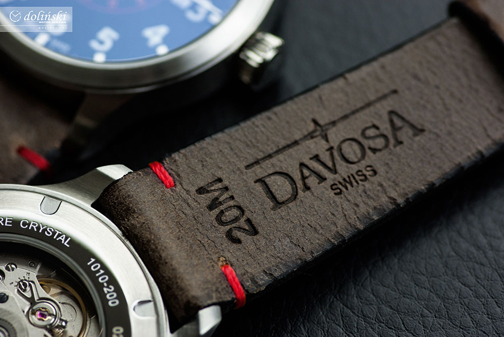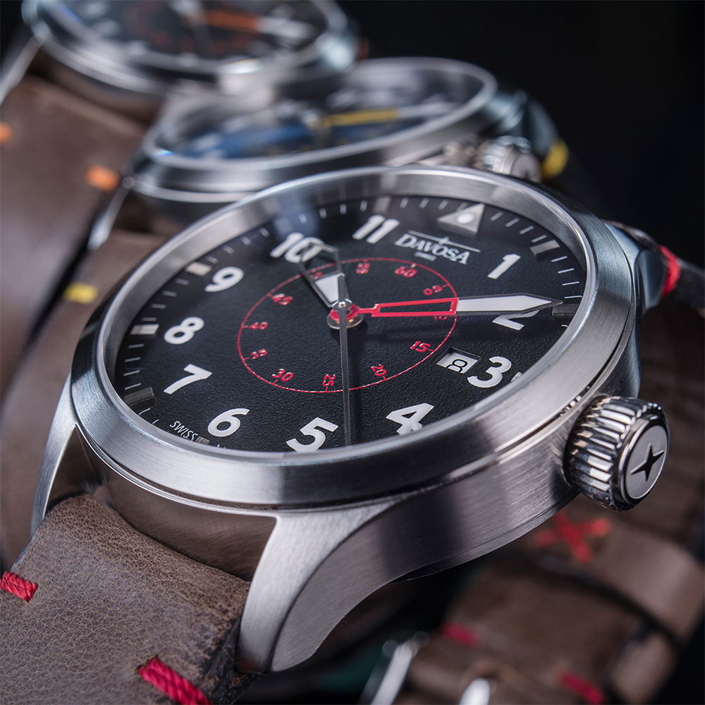 Pánské hodinky pro milovníky oblohy, Davosa Neoteric Pilot Automatic. Pouzdro z nerezové oceli o průměru 42 mm, v něm pevně uzavřený ciferník a korunka pro nastavení času dodávají této mimořádné časomíře jedinečný styl, Pilot. Dobře čitelný černý ciferník s arabskými číslicemi má uprostřed červené značky minut. Tři různé ručky, včetně hodinové a minutové, jsou částečně odříznuty. Minutová ručička má ve spodní části zářez a je červeně orámována pro snadné a rychlé čtení minut. Hodinová ručička má v horní části zářez. Kožený řemínek ve vintage vzhledu odkazuje na tradici leteckých hodinek.