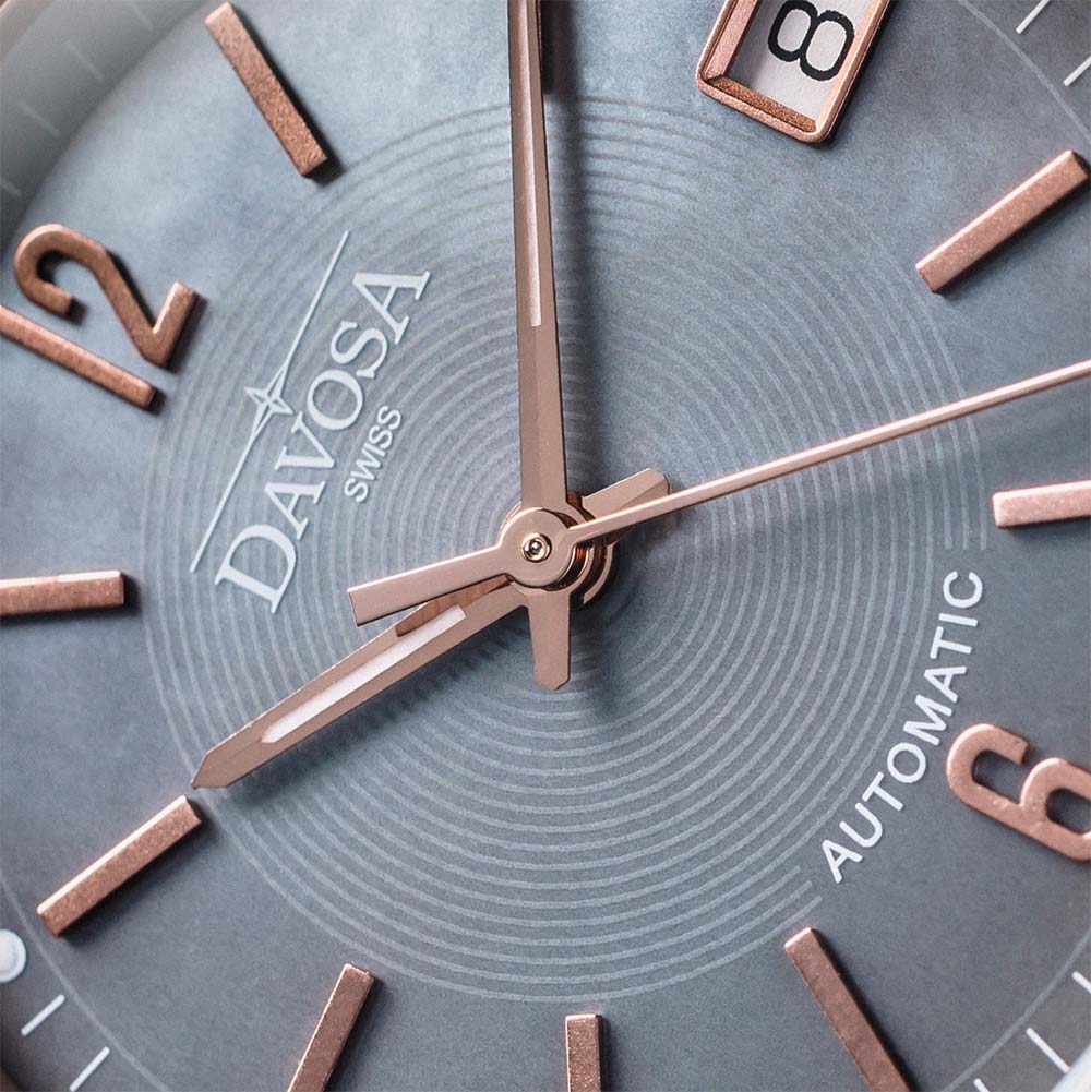 Přirozený lesk pravé perleti definuje ciferník Davosa Newton Lady, který je k dispozici v přírodní bílé, ultramarínové nebo oysterově šedé. Guilloché oblast uprostřed se střídá s hladkou oblastí, která tvoří základ pro ručně aplikované pozlacené číslice, a končí tištěným odpočítávacím časovačem a svítícími body. Ručičky jsou diskrétně integrované a – také díky SuperLumiNova BGW9 – jsou v noci jasně viditelné.