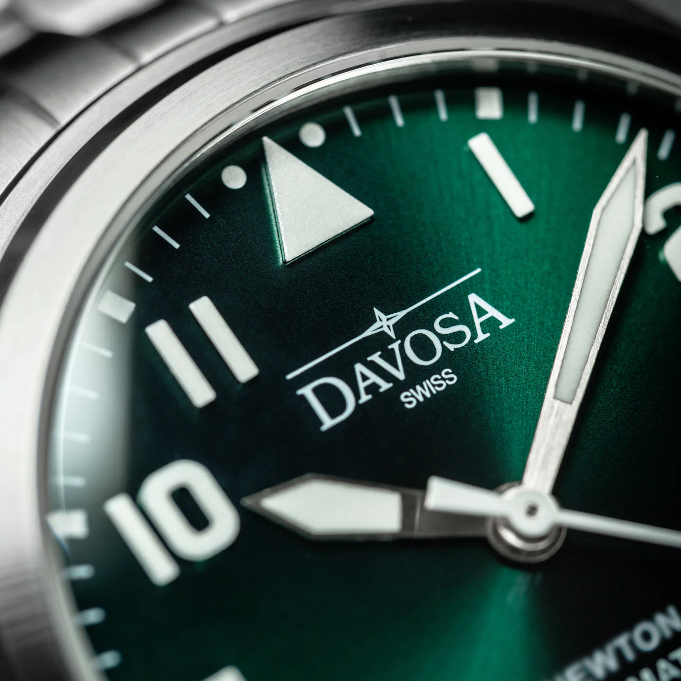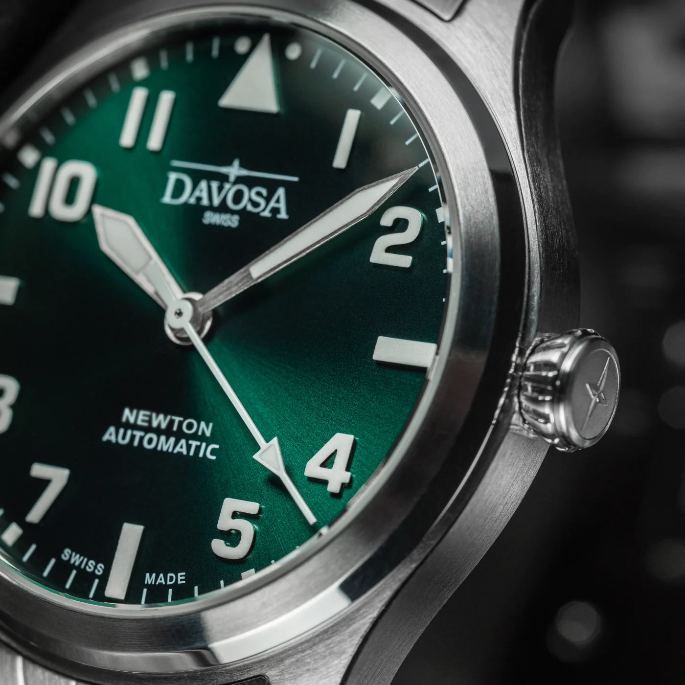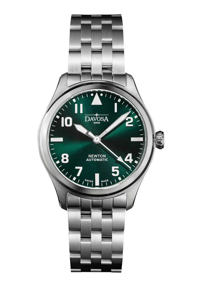 Davosa Newton Pilot Automatic 161.530.70 pánské hodinky v leteckém stylu navržené k oslavě 120. výročí prvního pokusu o let bratří Wrightů. Stříbrná varianta se zeleným číselníkem z nové řady Davosa Newton Pilot Automatic speciálně vyvinutá pro náročné potřeby letců. Nejnovější série se připojuje k Newtonovi od Davosa, věnované vynálezci času Isaacu Newtonovi.