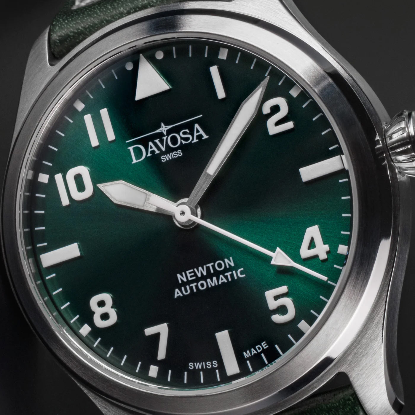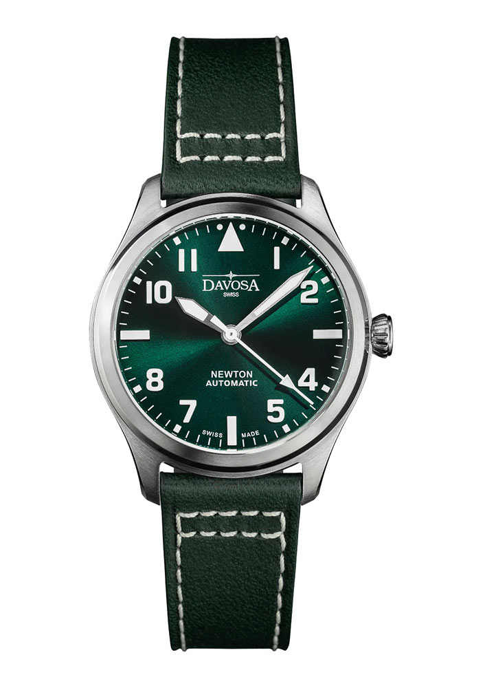 Davosa Newton Pilot Automatic 161.530.75 pánské hodinky v leteckém stylu navržené k oslavě 120. výročí prvního pokusu o let bratří Wrightů. Zelená varianta nové řady Davosa Newton Pilot Automatic speciálně vyvinutá pro náročné potřeby letců. Nejnovější série se připojuje k Newtonovi od Davosa, věnované vynálezci času Isaacu Newtonovi.