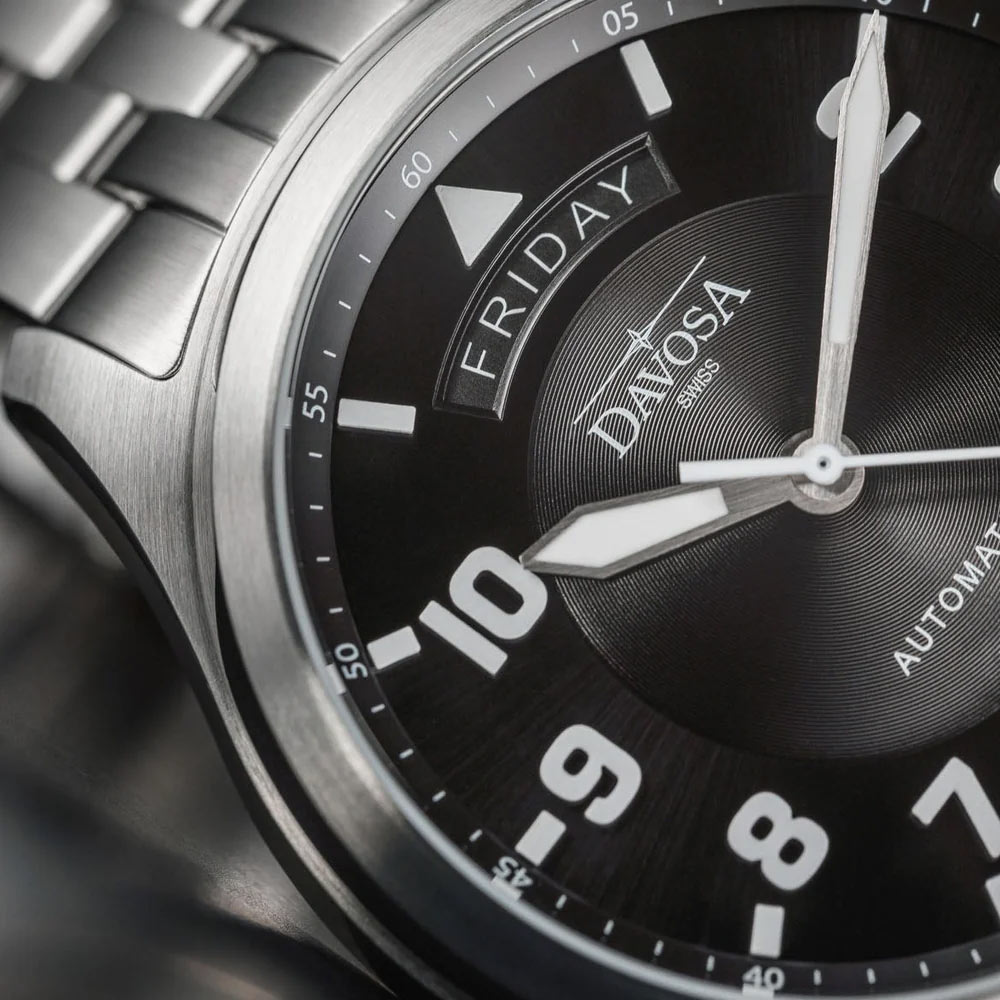 Řada Newton od DAVOSA se zaměřuje na originální požadavky na navigaci a zdůrazňuje jejich význam v historii objevů. Jedinečný ciferník kryje nejkvalitnější safírové sklíčko. Charakteristický trojúhelník označuje hodinu „12 hodin“ a odkazuje na časy, kdy piloti potřebovali jediný pohled, aby jasně určili polohu ručiček a přesně odečetli čas. Velké arabské číslice a doplňkové indexy na černém pozadí spolu s kosočtvercovým tvarem ruček zdůrazňují výbornou čitelnost. Všechny prvky navíc v noci svítí díky použití nejnovějšího luminiscenčního materiálu Super-LumiNova BGW9, díky kterému ciferník ve tmě svítí.