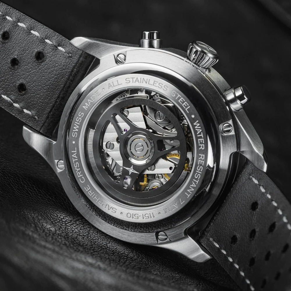 Hodinky se dodávají ve 42mm ocelovém pouzdře se zakřiveným antireflexním safírovým sklíčkem, které kryje stříbrný ciferník. Vyznačuje se klasickým stylem a vynikajícím zpracováním včetně saténových a leštěných detailů. Jeho jedinečnost odhaluje čtyřšroubové safírové pouzdro, které odhaluje další nádherný prvek - plně skeletovaný rotor vyrobený z BEYOND STEEL® v podobě stylizovaného volantu. Vysoká hustota tohoto pokročilého materiálu, navzdory jeho jemné estetice, z něj činí vynikající vodič energie. Výrobce své hodinky s automatickým chronografem Davosa spároval se sportovním koženým řemínkem s velkými očky ve stylu Rally.