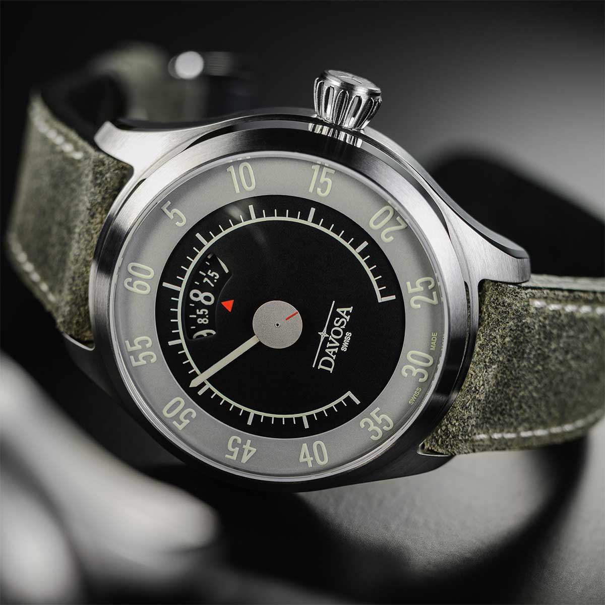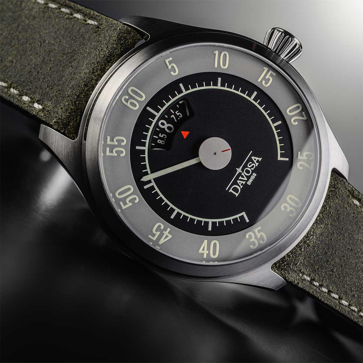 V 50. a 60. letech, v době německého hospodářského zázraku a Woodstocku, byl vůz ztělesněním osobní svobody – mocným symbolem nových začátků, dobrodružství a finančního blahobytu. Davosa Newton Speedometer 161.587.25 je věnován této velké době. Pryč jsou klasické ručičky a datumovka, které byste očekávali. Místo toho švýcarský hodinář vytvořil ciferník, který mohl pocházet z kokpitu legendárního sportovního vozu. Vyznačuje se jemnou elegancí, zaujme svou výrazností a nadčasovostí. Stejně jako v automobilovém průmyslu v 50. a 60. letech 20. století vnesli designéři Davosa do designu číselníku rychloměru Newton zvláštní kreativitu. Hodinová ručička byla nahrazena otočným ciferníkem, který ukazuje čas v okénku na 12. Přesný čas se odečítá červenou elegantní šipkou. Centrálně umístěná minutová ručka odkazuje na rychloměry v autech, je velká a čitelná a minutová stupnice v pěti krocích je vyjádřena klasickým jednoduchým písmem. Uprostřed se druhý disk diskrétně otáčí v podobě matně stříbrného disku zvýrazněného červenou linkou. Toto vynikající složení je dostupné ve dvoubarevné šedé a černé verzi s přírodní Super-LumiNova , která se na denním světle žlutě zeleně třpytí. Při slabém osvětlení vám svítící materiál umožňuje číst hodiny a minuty v bledě modré barvě. Na čitelnost jistě nějakou dobu trvá, než si na ni zvyknete, ale jakmile pochopíte základní princip, jsou Davosa Newton Speedometer skutečně fascinujícími hodinkami, které jistě zaujmou.