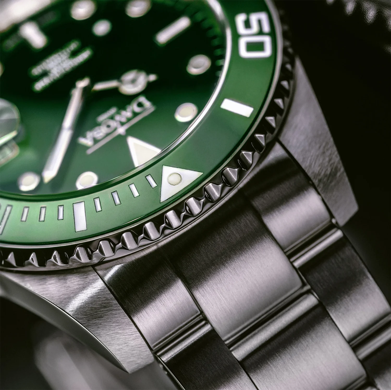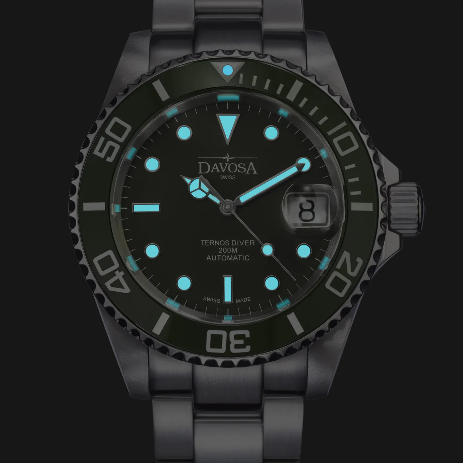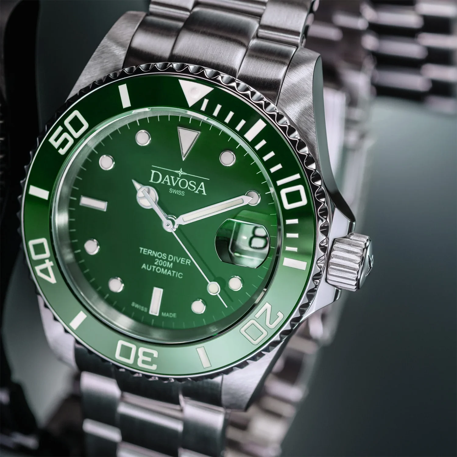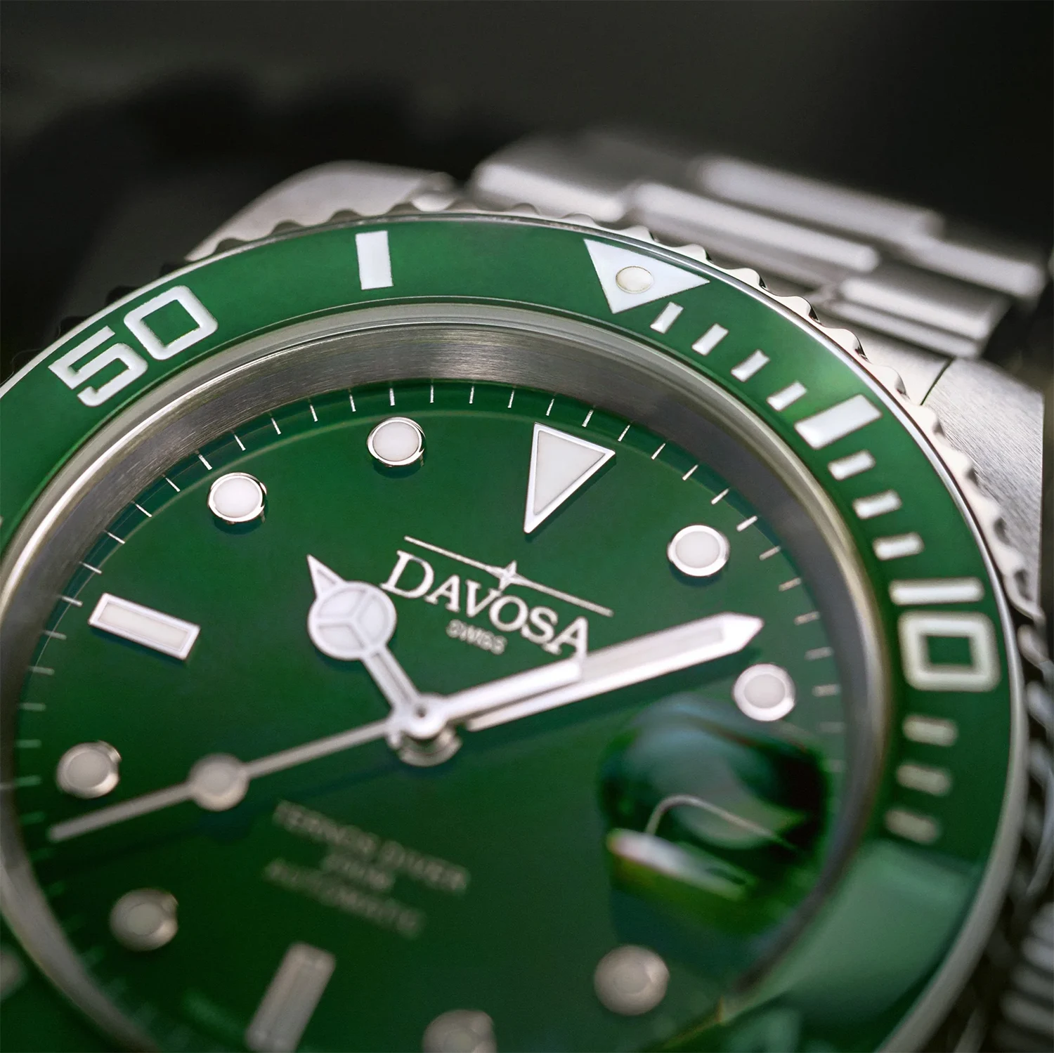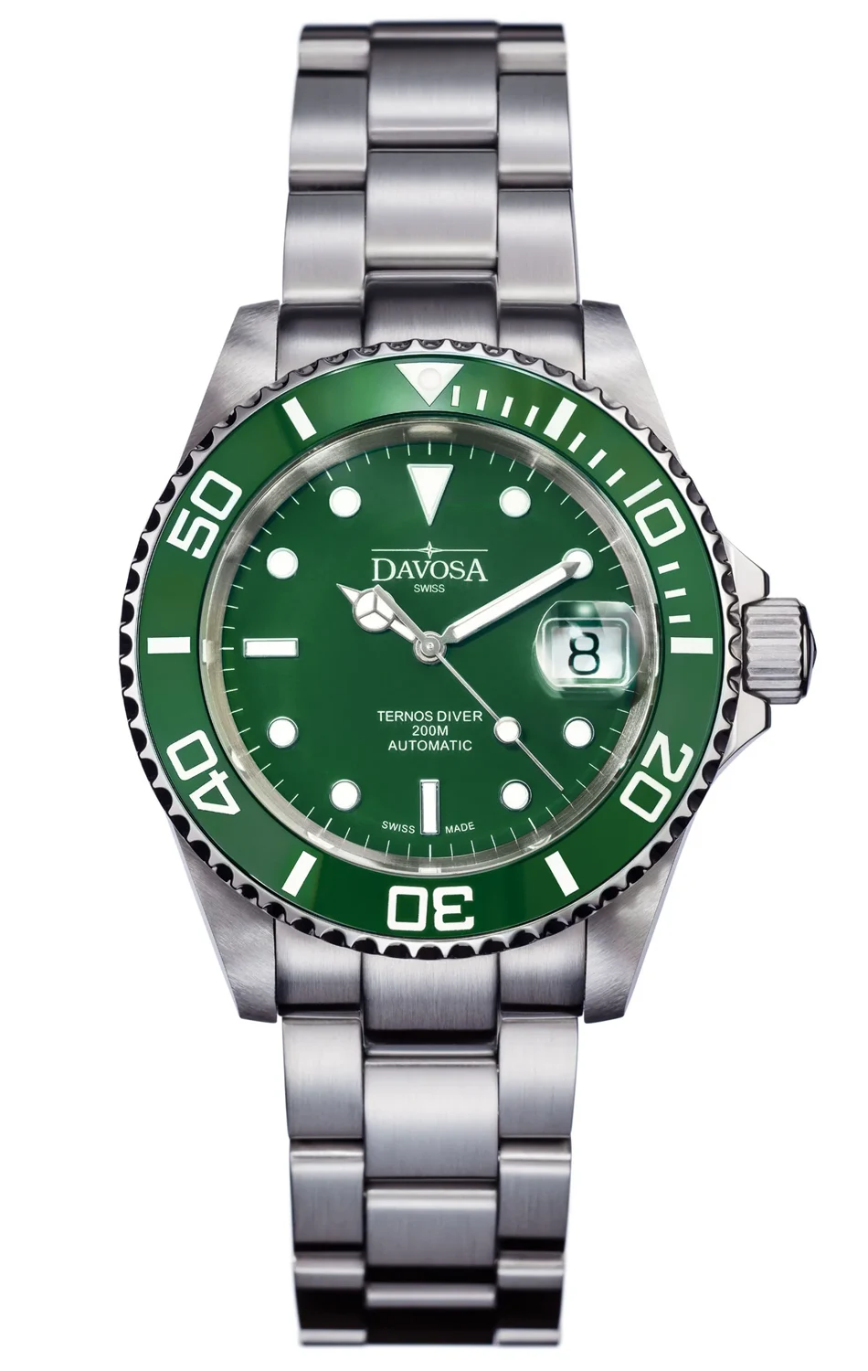 Davosa Ternos Ceramic 161.555.70.W jsou potápěčské hodinky s nadčasovým designem, které obstojí ve vodě i na souši. Díky charakteristické zelené barvě a třířadému ocelovému náramku se stávají univerzálním modelem – připraveným na každou výzvu.