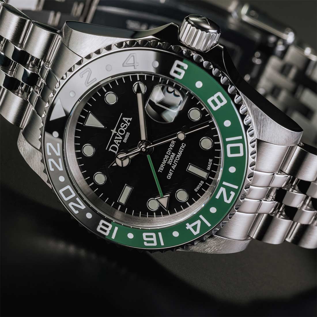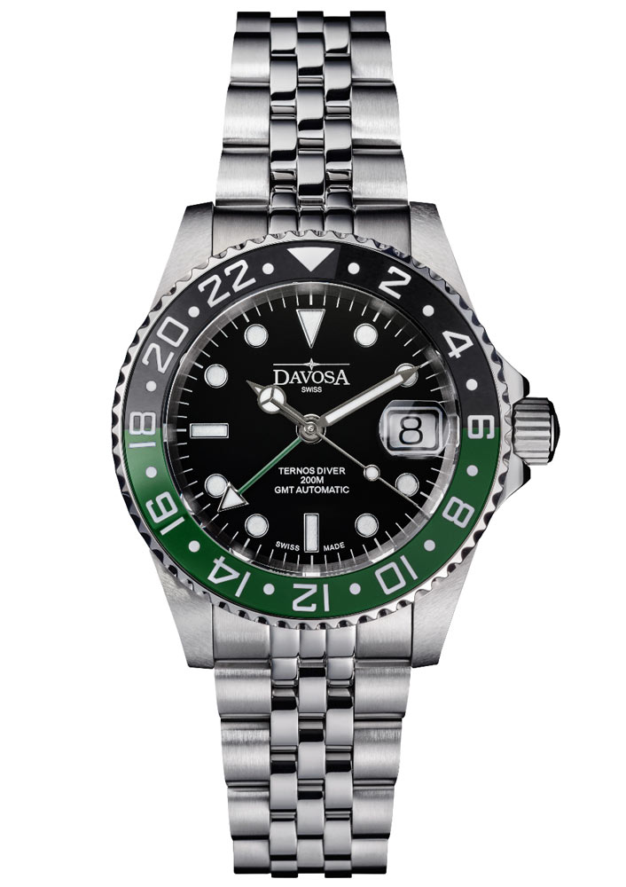 Ocelové pouzdro o průměru 40 mm ukrývá spolehlivý strojek Davosa DAV 3032 založený na kalibru Sellita SW330-1. Automatický mechanismus nabízí 56 hodin rezervy chodu a komplikaci GMT, která umožňuje současné sledování dvou časových pásem. Na černém ciferníku se nacházejí výrazné indexy a ručky vyplněné Super-LumiNova® BGW09, jež zaručují výbornou čitelnost v temných hlubinách i během nočních cest. Zelená GMT ručka ladí s barevným akcentem lunety a podtrhuje harmonii designu.