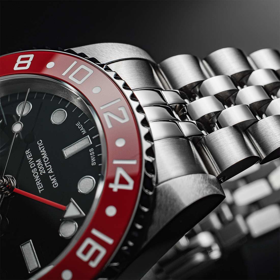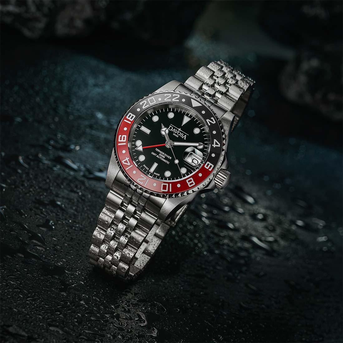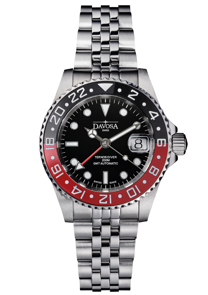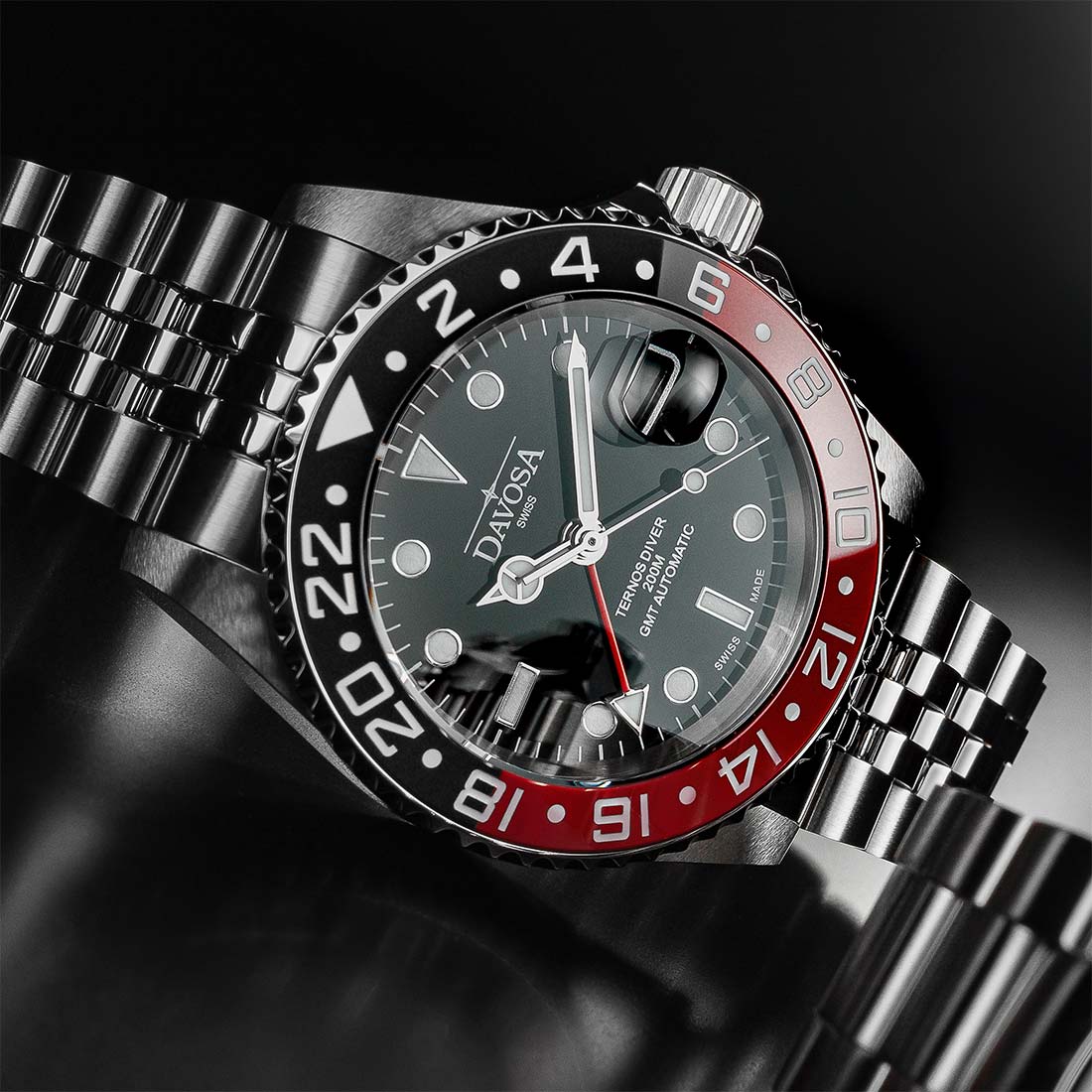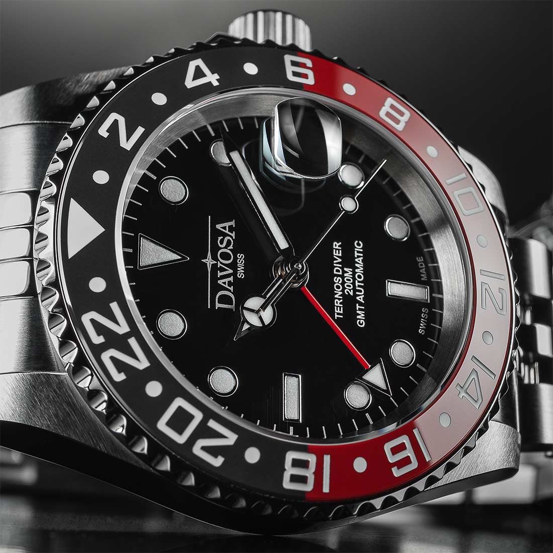 Ocelové pouzdro o průměru 40 mm ukrývá automatický strojek Davosa DAV 3032 (Sellita SW330-1) s rezervou chodu 56 hodin. Čas se zobrazuje na černém ciferníku, kde výrazné indexy a ručky potažené Super-LumiNova® BGW09 zajišťují čitelnost jak v temných hlubinách, tak při nočních cestách. Červená GMT ručka se jasně odlišuje na pozadí ciferníku a umožňuje rychlý odečet času ve druhé zóně.