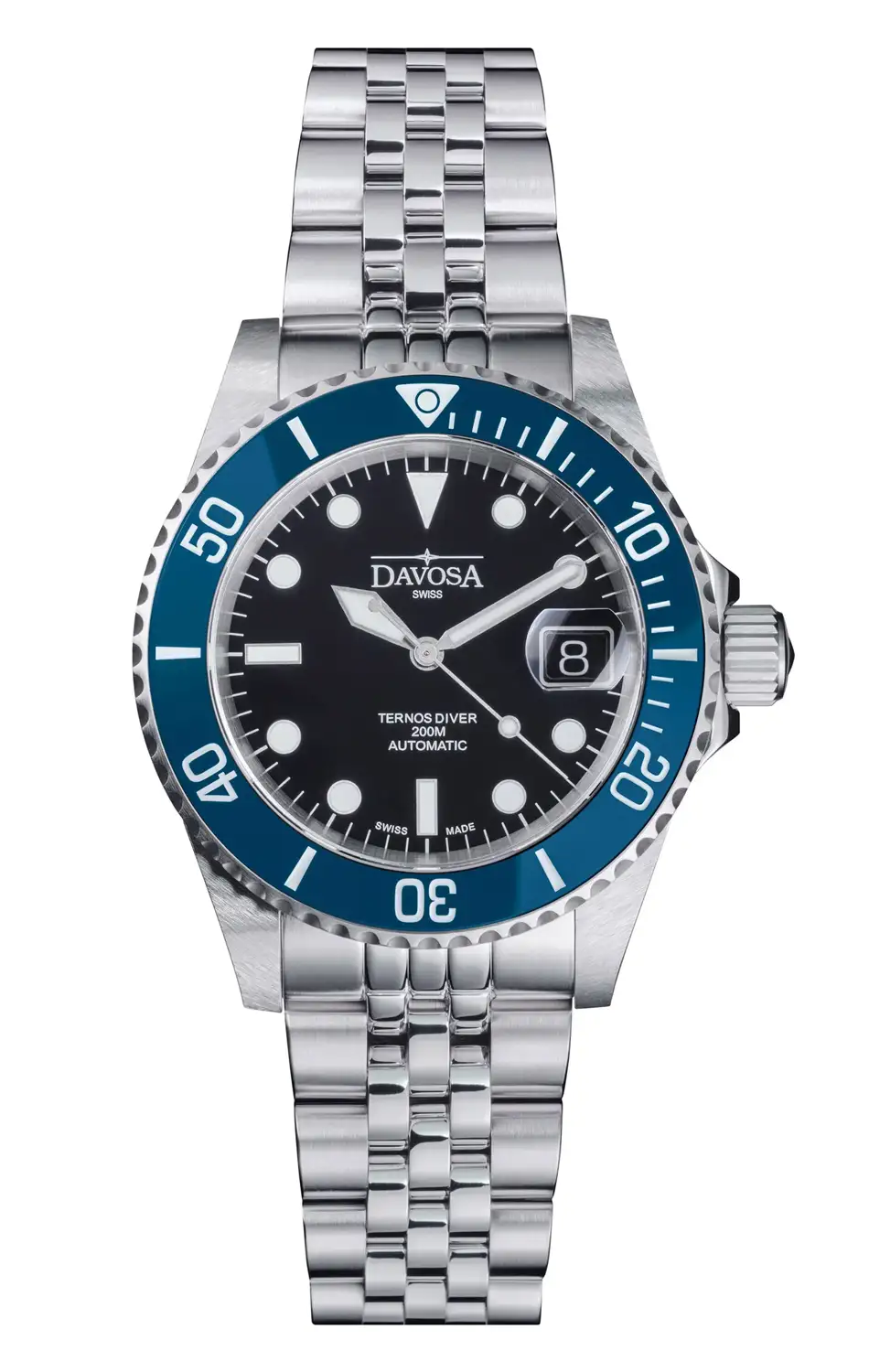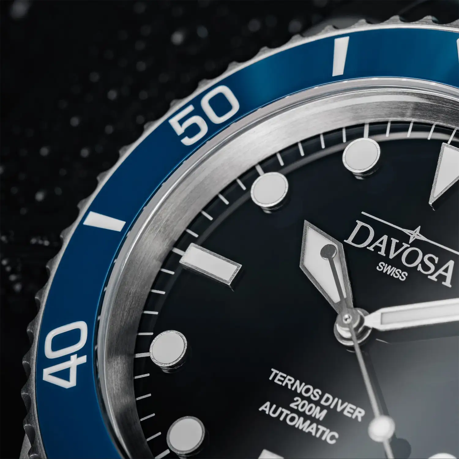 Davosa Ternos Diver 161.552.04 jsou klasické pánské potápěčské hodinky, které spojují osvědčenou estetiku diver modelu s výrazným, elegantnějším akcentem. Černý ciferník v kombinaci s modrou keramickou lunetou vytváří harmonickou a dobře čitelnou kompozici, zatímco charakteristický ocelový náramek typu Jubilee, označovaný značkou Davosa jako TriaLink, dodává celku jemně šperkový charakter, aniž by se vytratila sportovní identita.
