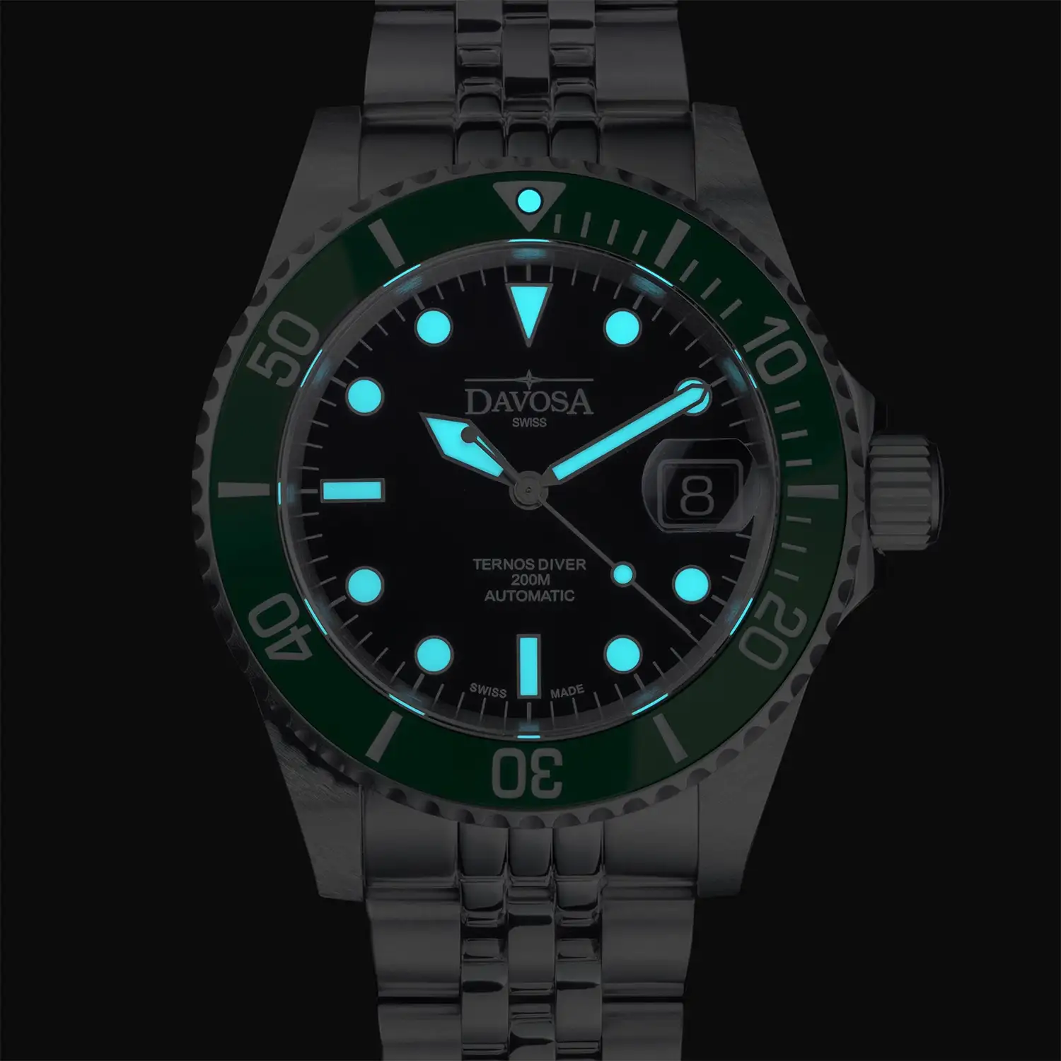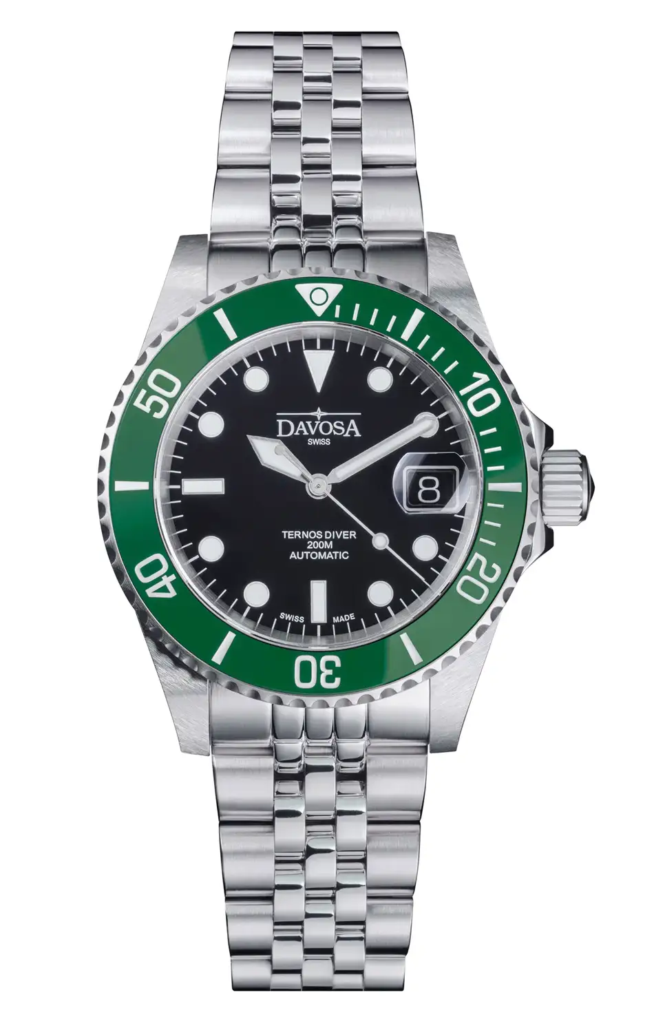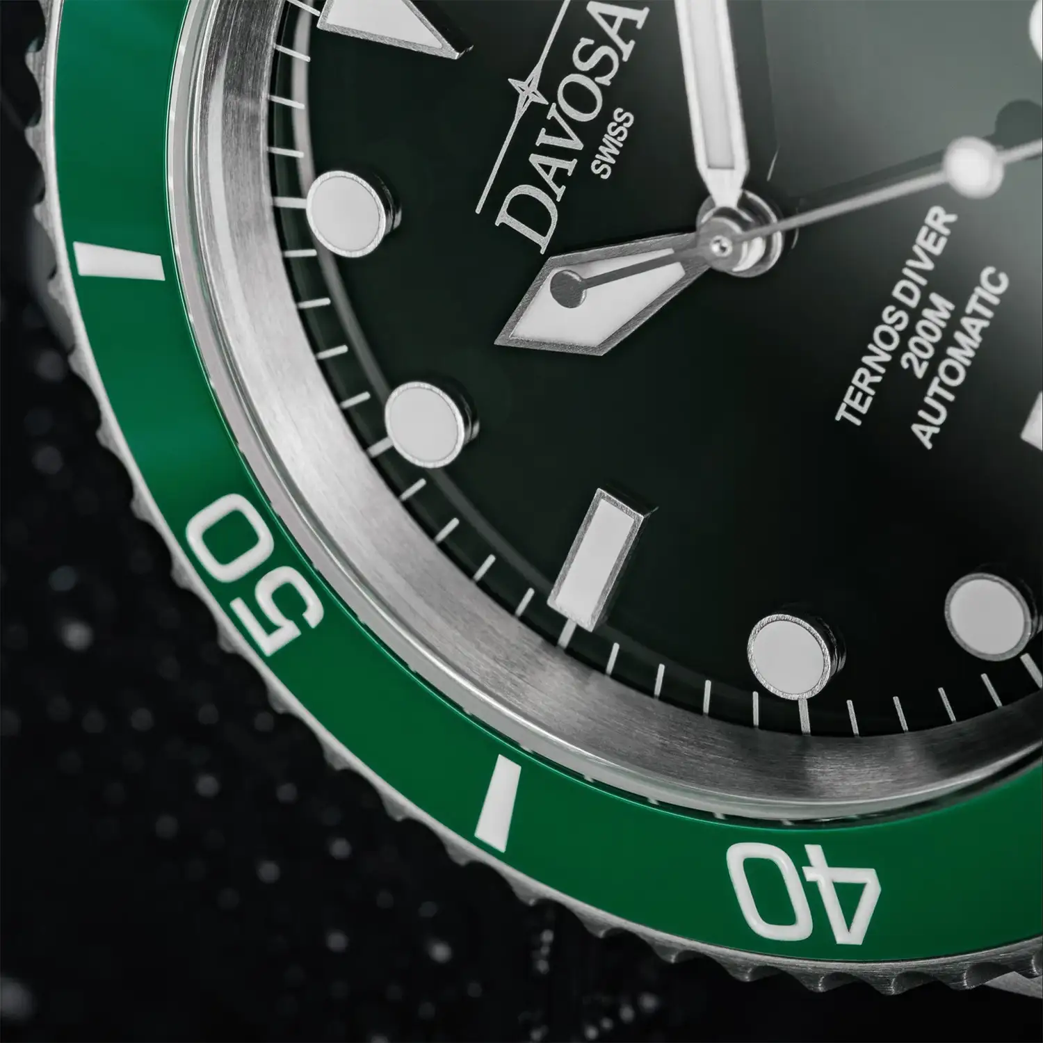 Davosa Ternos Diver 161.552.07 jsou švýcarské pánské potápěčské hodinky, které spojují klasickou estetiku diver hodinek s výrazným, moderním barevným akcentem. Zelená keramická luneta dodává modelu svěžest a charakter a evokuje hlubokou vodu i přirozené potápěčské prostředí. Černý ciferník zůstává maximálně čitelný a ocelové pouzdro o průměru 40 mm si zachovává ideální proporce jak pro každodenní nošení, tak pro vodní aktivity.