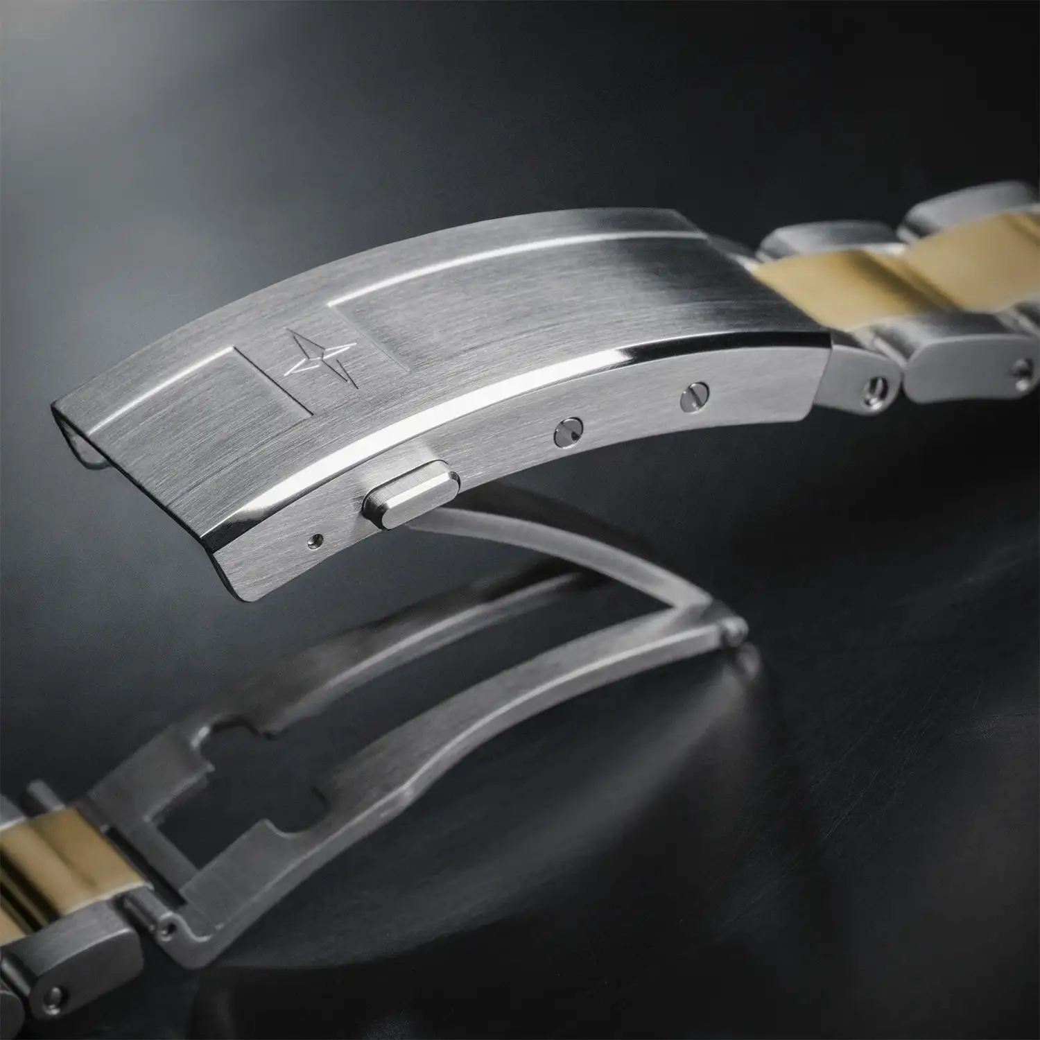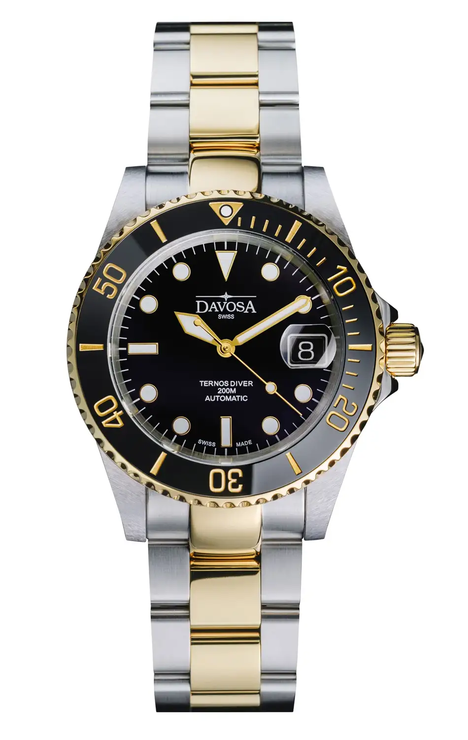 Davosa Ternos Diver 161.553.50 jsou pánské potápěčské hodinky s výrazně elegantním charakterem, které spojují sportovní funkčnost s nadčasovou kombinací ušlechtilé oceli a zlatých akcentů. Černý ciferník tvoří kontrastní, klidné pozadí pro zlacené indexy a ručky, díky čemuž si hodinky zachovávají vysokou čitelnost a zároveň působí na zápěstí mimořádně ušlechtile.