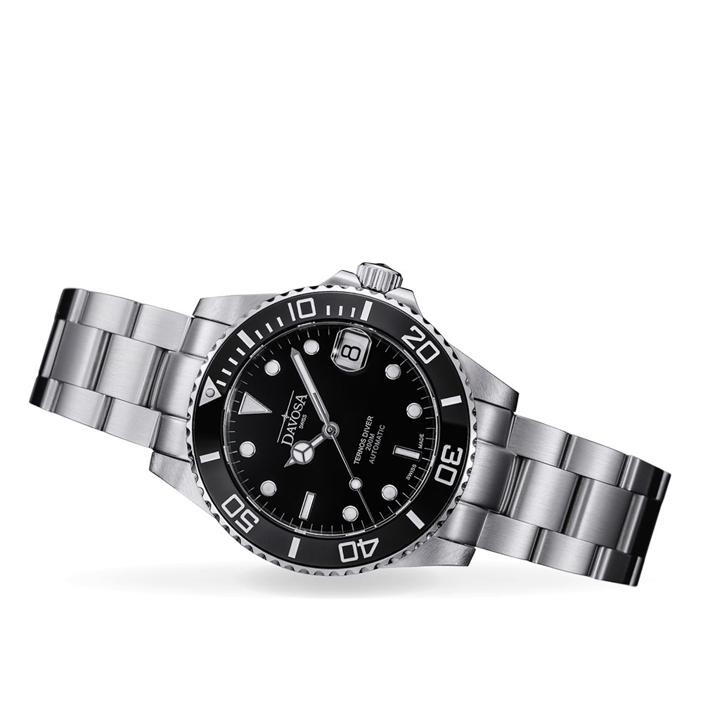 Navržený model diverského stylu z kolekce TERNOS splňuje kritéria vysoké kvality, dokumentovaný podpisem SWISS MADE , i vizuální třídy. Jeho ovoce je vidět nejen ve stříbrné a černé barvě, ale také v duálních tvarech ukazatelů hodin, které tvoří identitu zařízení, nebo v ručičkách, které dodávají sportovní přesah. Zmíněné hodinové značky - ty na ciferníku - jsou spolu s ručičkami pokryty luminiscenční hmotou . Jeho úkolem je osvětlit tyto prvky v nepřítomnosti světla nutného ke čtení času. Toto řešení jistě ocení lidé v tmavých podvodních koutech. Švýcarští výrobci přidali k hodinkám další minutovou stupnici na černé lunetě z moderní keramiky . Jeho účelem je usnadnit orientaci v minutovém rozsahu a zároveň doplnit sportovní design. Mezi funkcemi je také datumovka na 3. hodině, jejíž součástí je unikátně lupa. Ciferník je chráněn nejkvalitnějším safírovým sklem s antireflexní vrstvou . Samotné sklo se vyznačuje dokonalou průhledností a díky své specifičnosti zaručuje vysokou odolnost proti poškrábání. Navíc díky zátěru zajišťuje odraz nežádoucích slunečních odlesků, přispívá k přesnému odečítání času za všech světelných podmínek. Pouzdro s korunkou a náramek jsou vyrobeny z nerezové oceli , která ochrání povrch dílů před korozí.