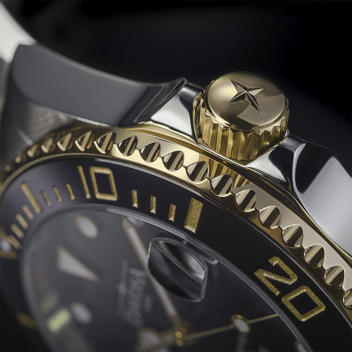 Hodinky v diverském stylu z kolekce TERNOS splňují kritéria vysoké kvality, doložené podpisem SWISS MADE , i vizuální třídy. Jeho ovoce je vidět nejen v černé a zlaté barvě, ale také v duálních tvarech ukazatelů hodin, které tvoří identitu zařízení, nebo v ručičkách, které dodávají sportovní přesah. Zmíněné hodinové značky - ty na ciferníku - jsou spolu s ručičkami pokryty luminiscenční hmotou. Jeho úkolem je osvětlit tyto prvky v nepřítomnosti světla nutného ke čtení času. Toto řešení jistě ocení lidé v tmavých podvodních koutech. Švýcarští výrobci k hodinkám přidali další minutovou stupnici, přítomnou na černé lunetě z moderní keramiky odolné proti poškrábání . Mezi funkcemi je také datumovka na 3. hodině, jejíž součástí je unikátně lupa. Ciferník je chráněn nejkvalitnějším safírovým sklem s antireflexní vrstvou. Samotné sklo se vyznačuje dokonalou průhledností a díky své specifičnosti zaručuje vysokou odolnost proti poškrábání. Navíc díky zátěru zajišťuje odraz nežádoucích slunečních odlesků, přispívá k přesnému odečítání času za všech světelných podmínek. Pouzdro s korunkou a náramek jsou vyrobeny z nerezové oceli s prvky zlacenými žlutým PVD zlatem.