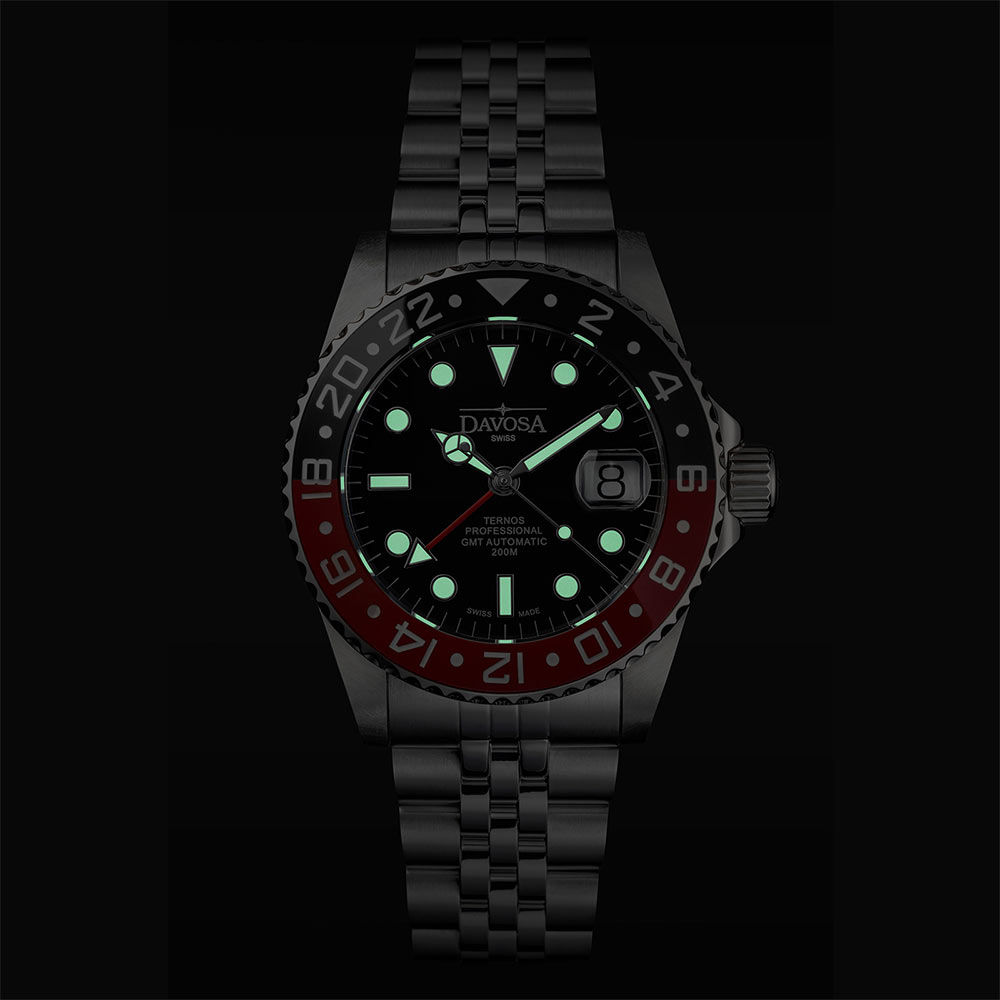Ciferník v hluboké černi nabízí dokonalou čitelnost – kulaté indexy a ručky byly pokryty vrstvou Super-LumiNova® BGW09, která ve tmě intenzivně svítí. Červená ručka GMT usnadňuje okamžitý odečet času druhého pásma na 24hodinové stupnici umístěné na keramickém kroužku. Luneta plní nejen praktickou funkci, ale díky své tvrdosti si zachovává bezchybný vzhled po dlouhá léta používání.