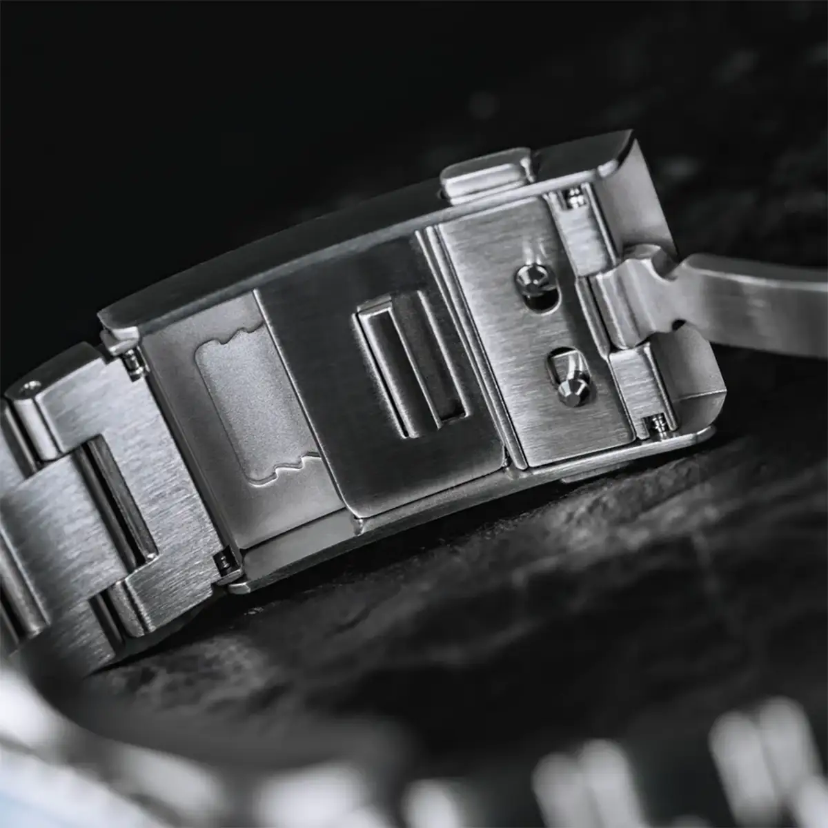 Celkový dojem doplňuje náramek z nerezové oceli v uspořádání TriaLink, který spojuje robustnost s pohodlím každodenního nošení. Inovativní spona WaveSlide umožňuje snadnou regulaci délky náramku – bez použití nářadí. Toto řešení ocení zejména potápěči, kteří nosí hodinky jak na holém zápěstí, tak na neoprenovém obleku.