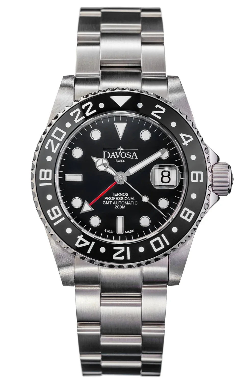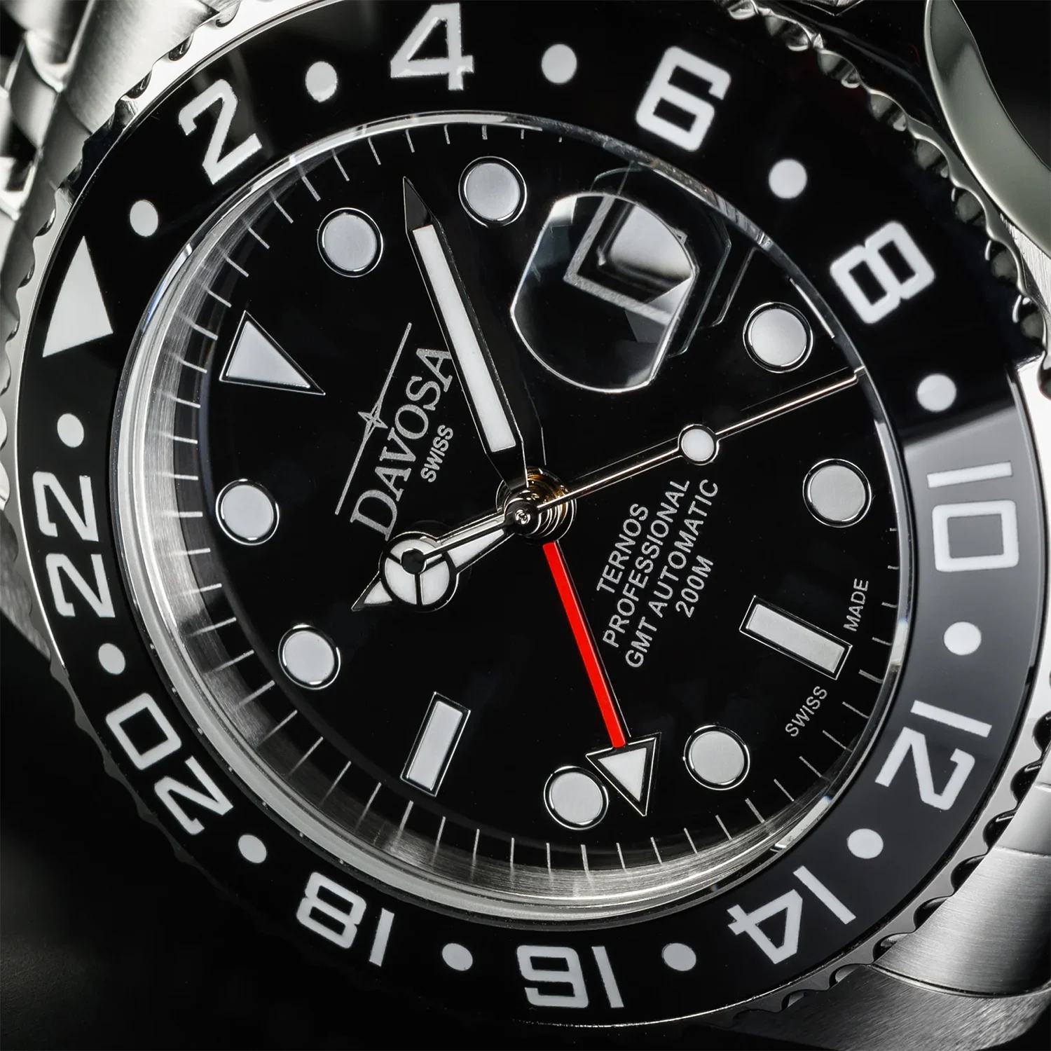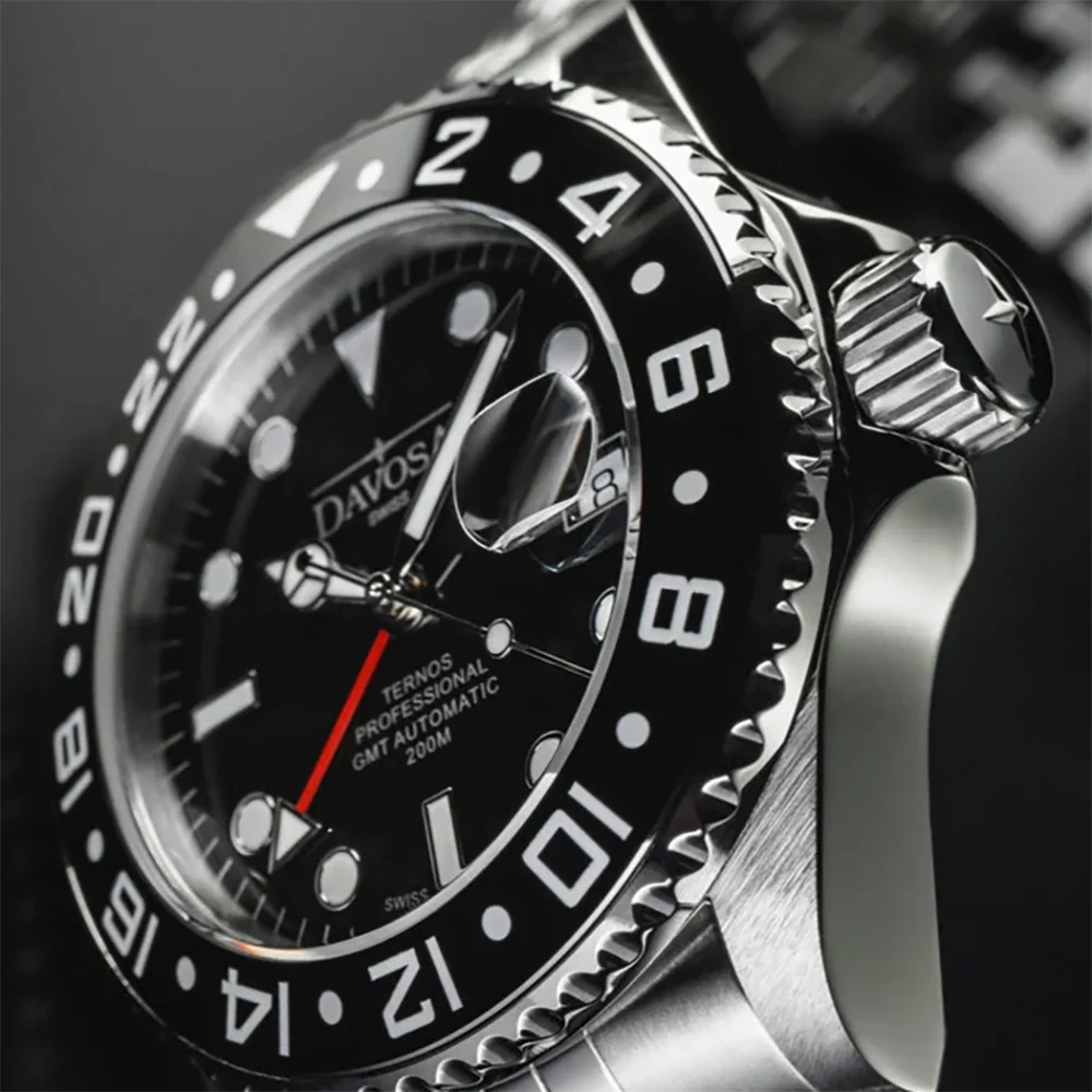 Davosa Ternos Professional GMT Automatic 161.571.50.W je ztělesněním nástrojových potápěčských hodinek spojených s funkcí GMT, která se již léta těší velké oblibě mezi cestovateli i profesionály. Tento model kombinuje odolnost diveru Swiss Made s nadčasovou estetikou černé barvy, čímž se stává jedněmi z nejuniverzálnějších hodinek v kolekci Davosa.