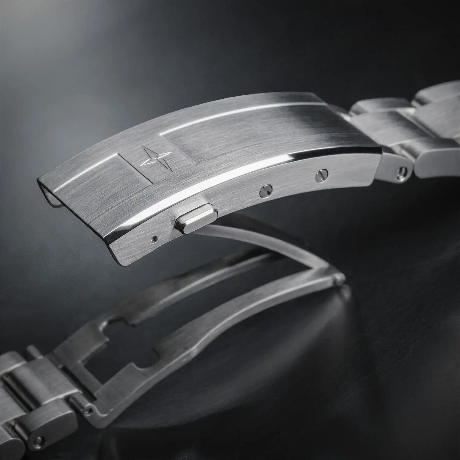 Model je osazen klasickým náramkem TriaLink, kombinujícím kartáčovanou a leštěnou ocel. Komfort při nošení zvyšuje inovativní spona WaveSlide, která umožňuje okamžitou regulaci délky – ideální jak pro každodenní použití, tak i při nasazování hodinek na neoprenový oblek.