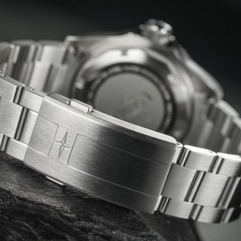 Diverské hodinky Davosa Ternos Professional Nebulous 16153550 jsou umístěny v pevně utěsněném ocelovém pouzdře o průměru 42 mm. Pouzdro je voděodolné do hloubky až 500 metrů. To vám umožní potápět se s vybavením bez obav z poškození mechanismu. Na pozici 9 hodin pouzdra hodinek je speciální automatický heliový ventil, který je nezbytný pro pobyt v tlakových komorách ve velkých hloubkách. Na pravé straně hodinek je tradičně šroubovací korunka u tří hodin. Na rubu je celozávitový kryt, který doplňuje celou konstrukci. Diverské hodinky Davosa Ternos Nebulous byly důkladně testovány. Materiál, ze kterého je postaven a utěsněn, zaručuje bezpečný průzkum podmořských hlubin. Hodinky jsou spárovány s ocelovým náramkem TriaLink. Náramek je opatřen bezpečným motýlkovým zapínáním a patentkou.