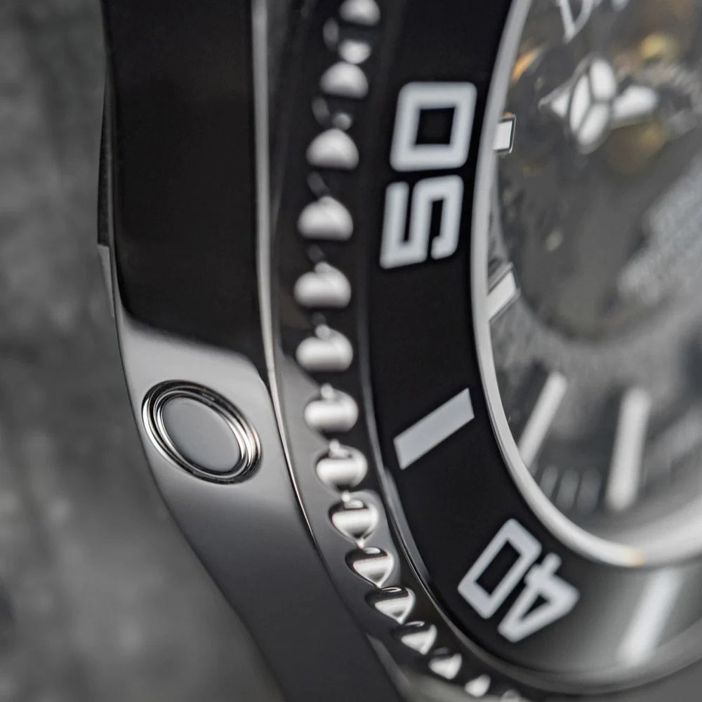 Na přední straně pouzdra hodinek Davos je vidět otočná luneta s keramickým rámečkem s minutovou stupnicí. Minutová stupnice vám pomůže sledovat ubíhající čas, například když diver potřebuje zkontrolovat hladinu kyslíku v láhvi. Otočná luneta je užitečná při mnoha fyzických aktivitách. Atraktivním doplňkem těchto diverských hodinek je skeletový číselník, který odhaluje mechanismus. Design číselníku umožňuje snadné odečítání času a obdivování prvků automatického mechanismu. Tento model využívá vysoce přesný švýcarský strojek DAV 3021. Systém poháněný pohybem zápěstí zajišťuje dokonalé měření času. Aktuální čas ukazují velké, čitelné ručičky a indexy na černém kroužku. Jsou naplněny speciální hmotou Super-LumiNova® BGW9 Swiss Made, která ve tmě jasně září. Na pozici 3 hodin byl umístěn ukazatel data se zvětšením. Označuje aktuální den v měsíci. Ciferník umožňuje pozorovat celý prsten s datumovkou.