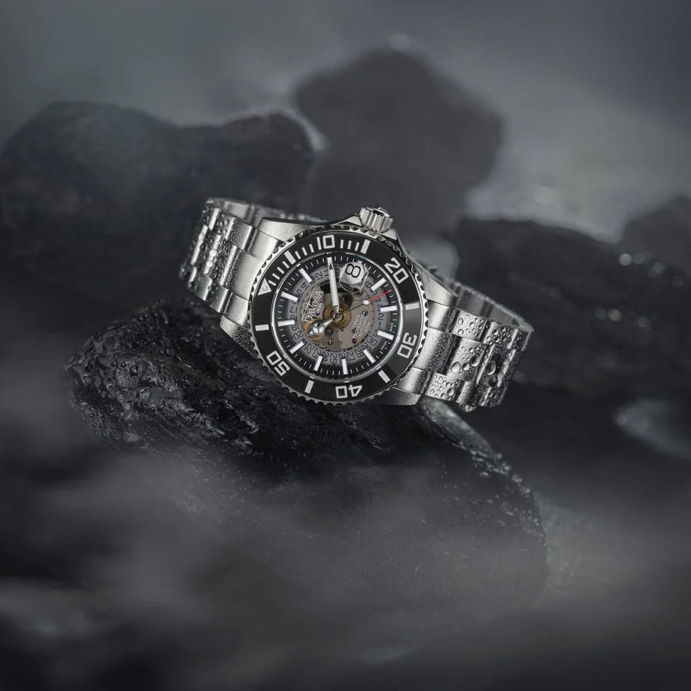 Davosa Ternos Professional Nebulous 161.535.50 jsou profesionální hodinky pro profesionální divere a ty, kteří jako amatéři objevují podmořský svět. Představená verze z portfolia Ternos Nebulous nabízí skeletové hodinky s odhaleným mechanismem. Nejmodernější technologie ve spojení s moderním designem tvoří dokonalý celek v podobě hodinek pro vodní sporty, ale i pro každodenní použití.