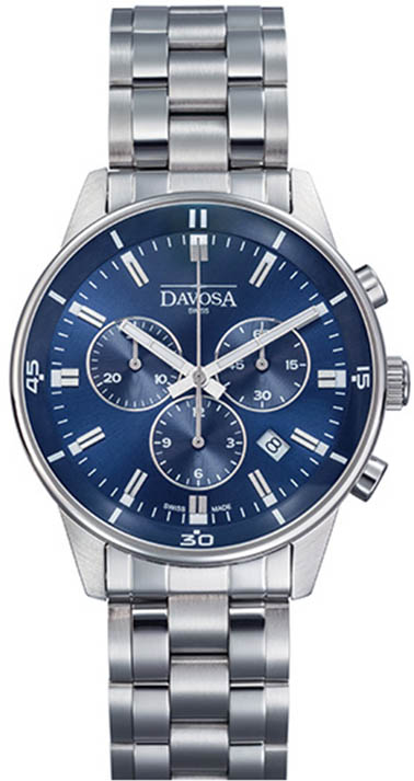 Kombinace elegance a sportu, velké pevné pouzdro z nerezové oceli, čitelný číselník a bateriový quartz Machineek s funkcí chronografu, stopky měřící vteřiny, minuty a hodiny. Modrý ciferník byl uzavřen pod vypouklým safírovým sklíčkem, což hodinkám dodává eleganci. Švýcarské hodinky Davosa.