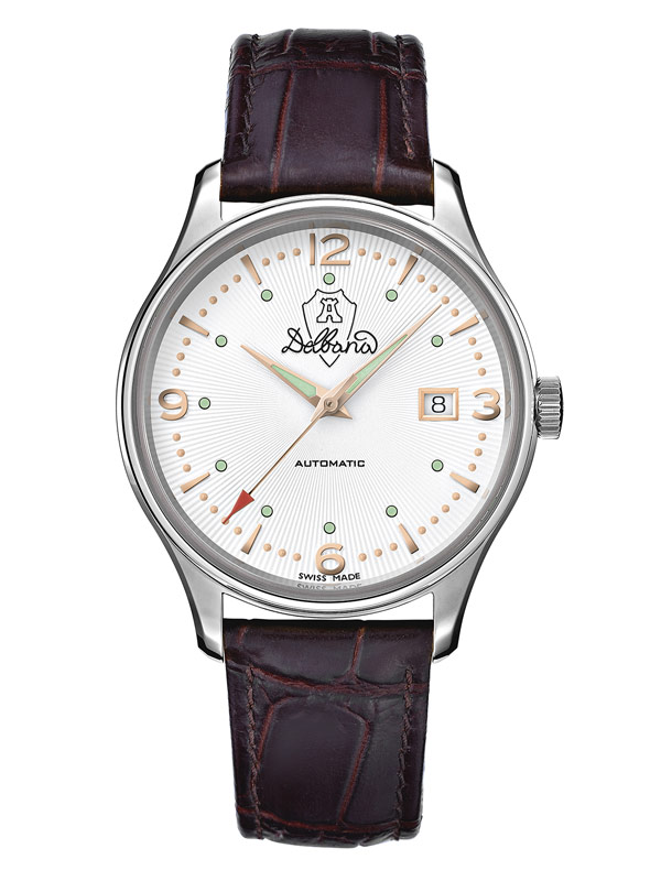 Luxusní švýcarské pánské hodinky Delbana z kolekce Della Balda vyrobené v retro stylu. Kulaté pouzdro z nerezové oceli ve stříbrné barvě. K pouzdru je připevněn hnědý kožený řemínek s klasickým zapínáním na přezku. Světlý ciferník se smíšenými indexy a růžově pozlacenými ručičkami, obohacený o přídavek v podobě funkce datumovky na třetí hodině, zakrývalo extrémně tvrdé a těžko poškrábatelné safírové sklíčko. Srdcem hodinek je automatický Machineek Sellita SW200 Swiss Made s rezervou chodu až 38 hodin. Práci mechanismu můžeme obdivovat díky skleněnému víku na zadní straně pouzdra.