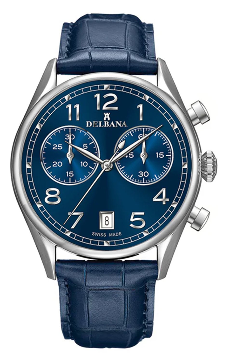 Na přední straně pánských hodinek Delbana se nachází tvrdé safírové sklo, které je odolné proti poškrábání. Pod ním je modrý ciferník s výraznými indexy a ručičkami ve tvaru listů, stejně jako dva velké čítače chronografu. Chronograf, který plní funkci stopek, přesně měří čas a je stylovým doplňkem obohacujícím vzhled ciferníku. Funkčnost modelu doplňuje datumovka umístěná na šesté hodině, která ukazuje aktuální den měsíce. Pánské hodinky Delbana na koženém pásku jsou sportovně elegantním modelem, který se perfektně hodí na pánské zápěstí. Značka Delbana, dbající na každý detail, vytvořila zajímavý časoměřič, který harmonicky spojuje retro styl se sportovním duchem.