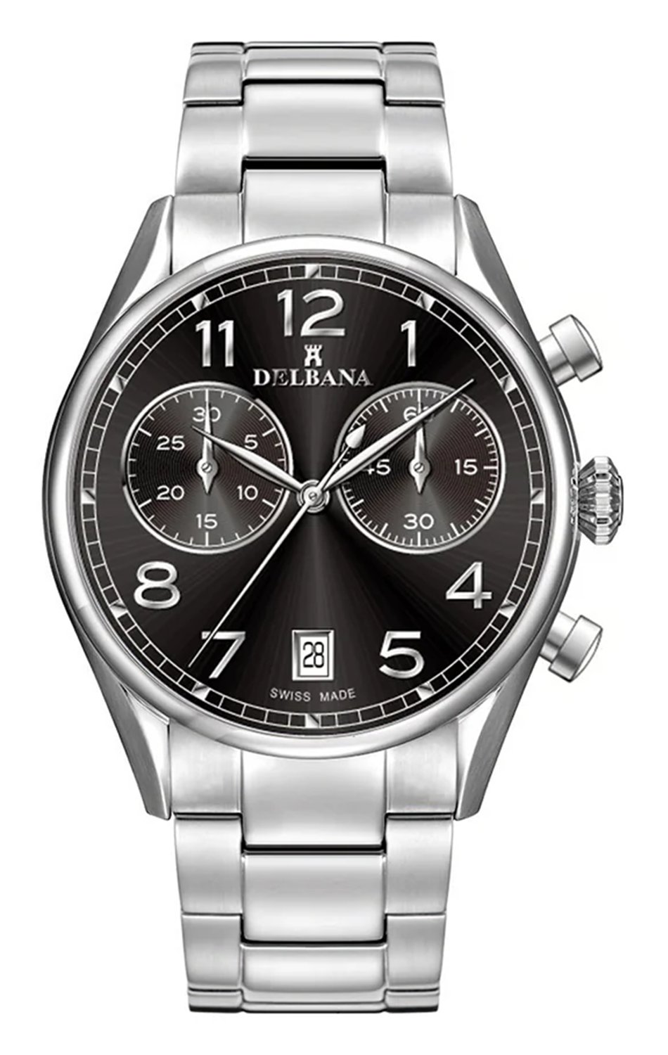 Na přední straně pánských hodinek Delbana se nachází tvrdé safírové sklo, které je odolné proti poškrábání. Pod ním je černý ciferník s výraznými indexy a ručičkami ve tvaru listů, stejně jako dva velké čítače chronografu. Chronograf, který plní funkci stopek, přesně měří čas a je stylovým doplňkem obohacujícím vzhled ciferníku. Funkčnost modelu doplňuje datumovka umístěná na šesté hodině, která ukazuje aktuální den měsíce. Pánské hodinky Delbana na náramku jsou sportovně elegantním modelem, který se perfektně hodí na pánské zápěstí. Značka Delbana, dbající na každý detail, vytvořila zajímavý časoměřič, který harmonicky spojuje retro styl se sportovním duchem.